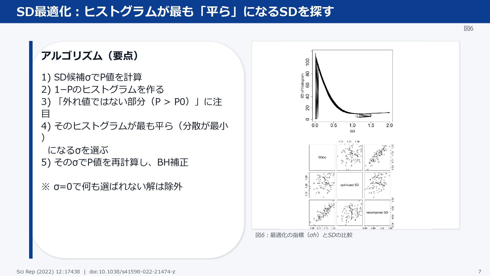 P0)」に注 目 4) そのヒストグラムが最も平ら(分散が最小 ) になるσを選ぶ 5) そのσでP値を再計算し、BH補正 ※ σ=0で何も選ばれない解は除外 図6:最適化の指標(σh)とSDの比較 Sci Rep (2022) 12:17438 | doi:10.1038/s41598-022-21474-z 7