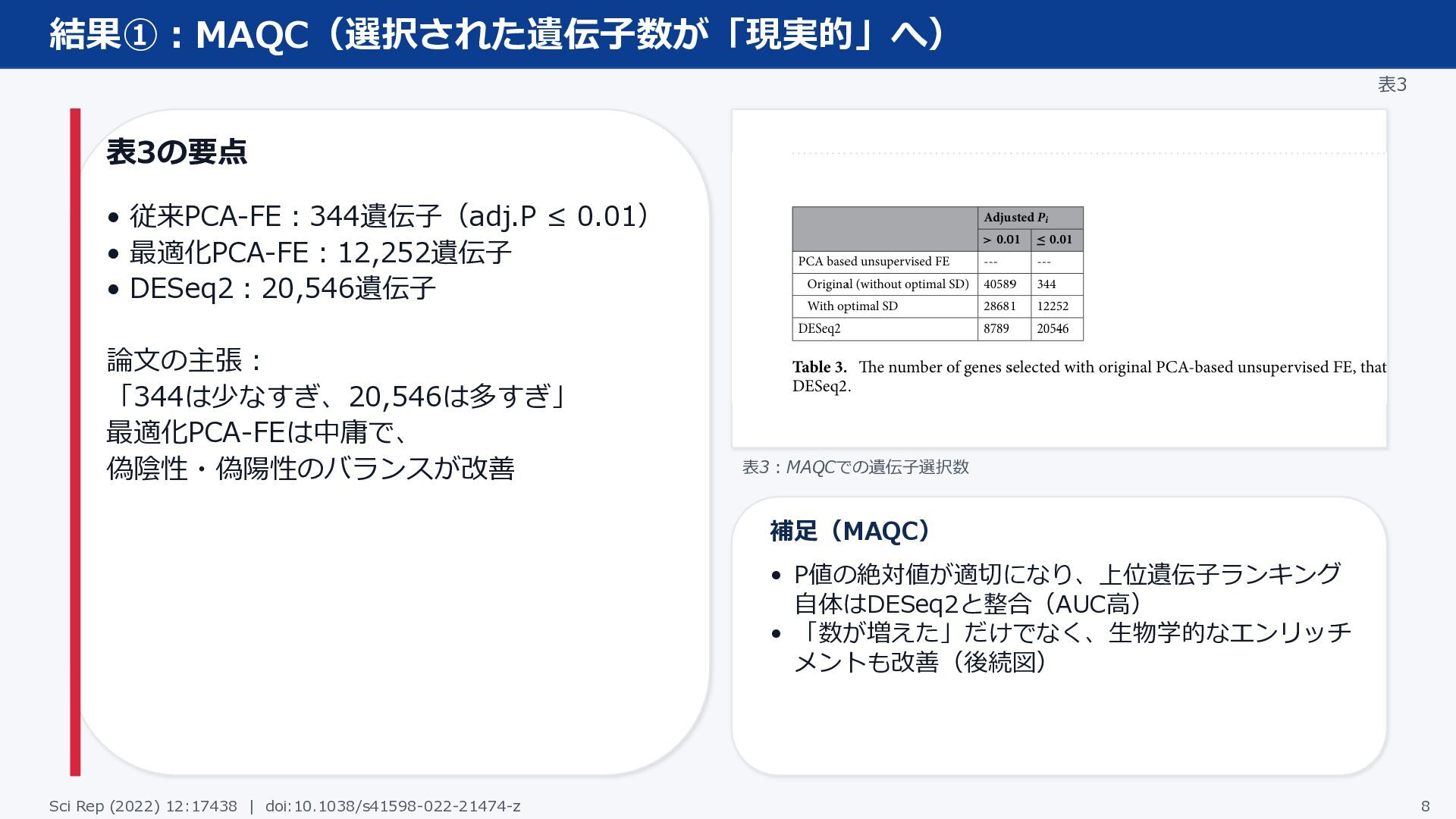 結果①:MAQC(選択された遺伝子数が「現実的」へ) 表3 表3の要点 • 従来PCA-FE:344遺伝子(adj.P ≤ 0.01) • 最適化PCA-FE:12,252遺伝子 •