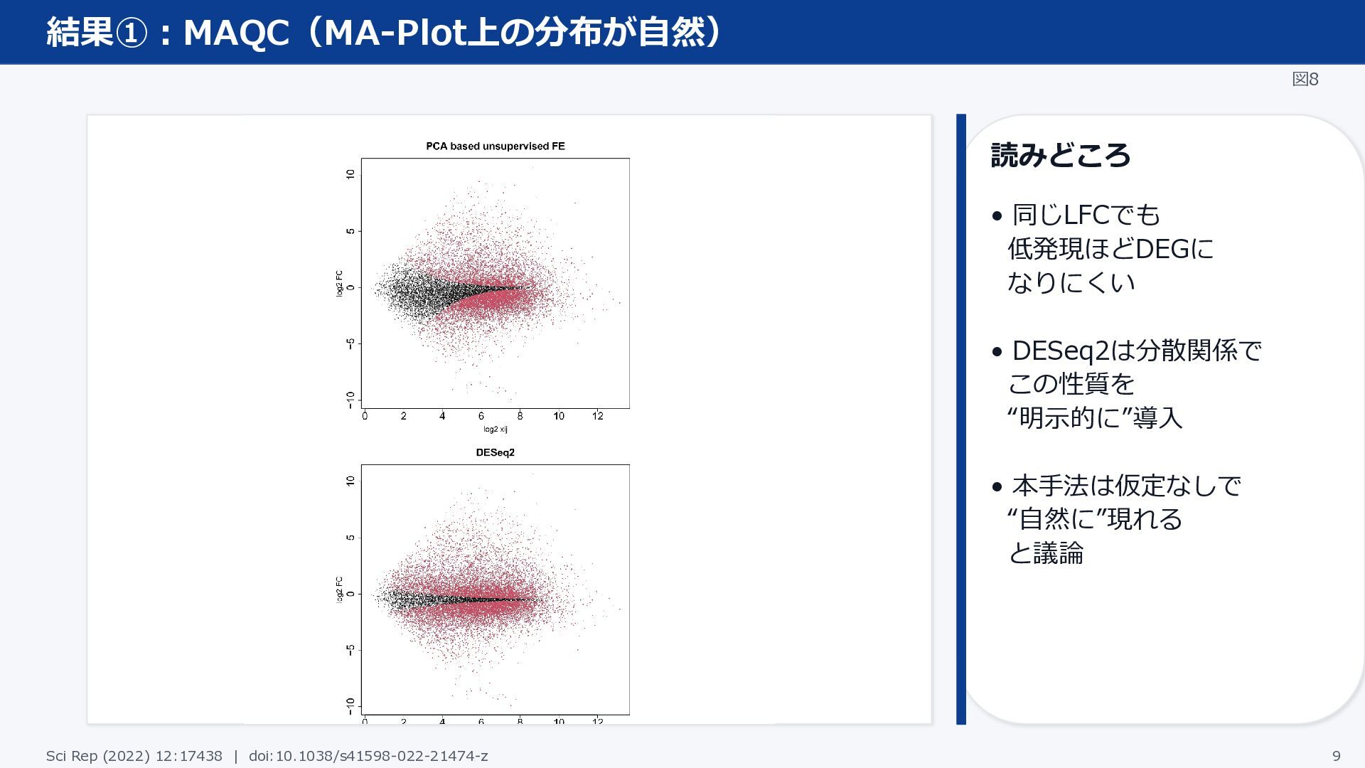結果①:MAQC(MA-Plot上の分布が自然) 図8 読みどころ • 同じLFCでも 低発現ほどDEGに なりにくい • DESeq2は分散関係で この性質を