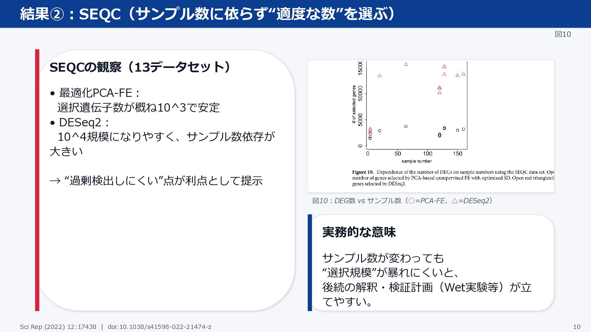 → “過剰検出しにくい”点が利点として提示 図10:DEG数 vs サンプル数(◦=PCA-FE、△=DESeq2) 実務的な意味 サンプル数が変わっても “選択規模”が暴れにくいと、 後続の解釈・検証計画(Wet実験等)が立 てやすい。 Sci Rep (2022) 12:17438 | doi:10.1038/s41598-022-21474-z 10