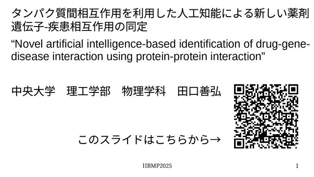 IIBMP2025 1 タンパク質間相互作用を利用した人工知能による新しい薬剤 遺伝子- 疾患相互作用の同定 “Novel artificial intelligence-based identification of