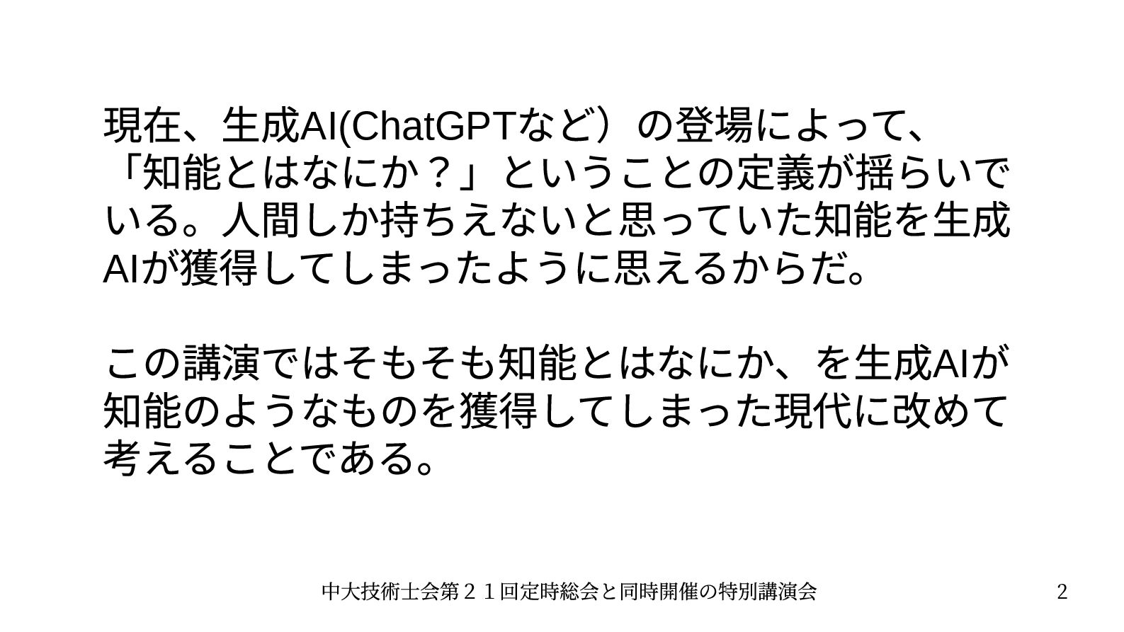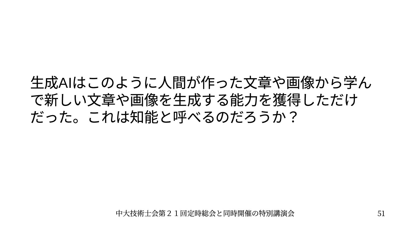中大技術士会第21回定時総会と同時開催の特別講演会 51 生成AI はこのように人間が作った文章や画像から学ん で新しい文章や画像を生成する能力を獲得しただけ だった。これは知能と呼べるのだろうか?