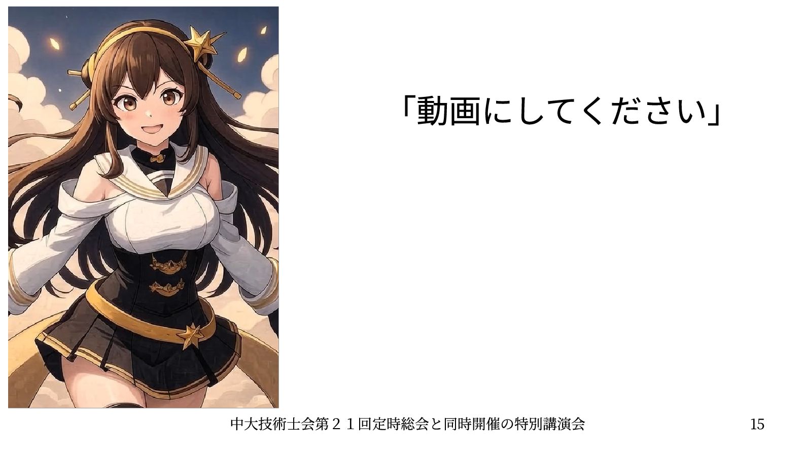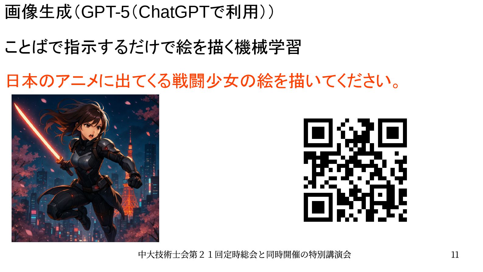 中大技術士会第21回定時総会と同時開催の特別講演会 11 画像生成(GPT-5(ChatGPTで利用)) ことばで指示するだけで絵を描く機械学習 日本のアニメに出てくる戦闘少女の絵を描いてください。