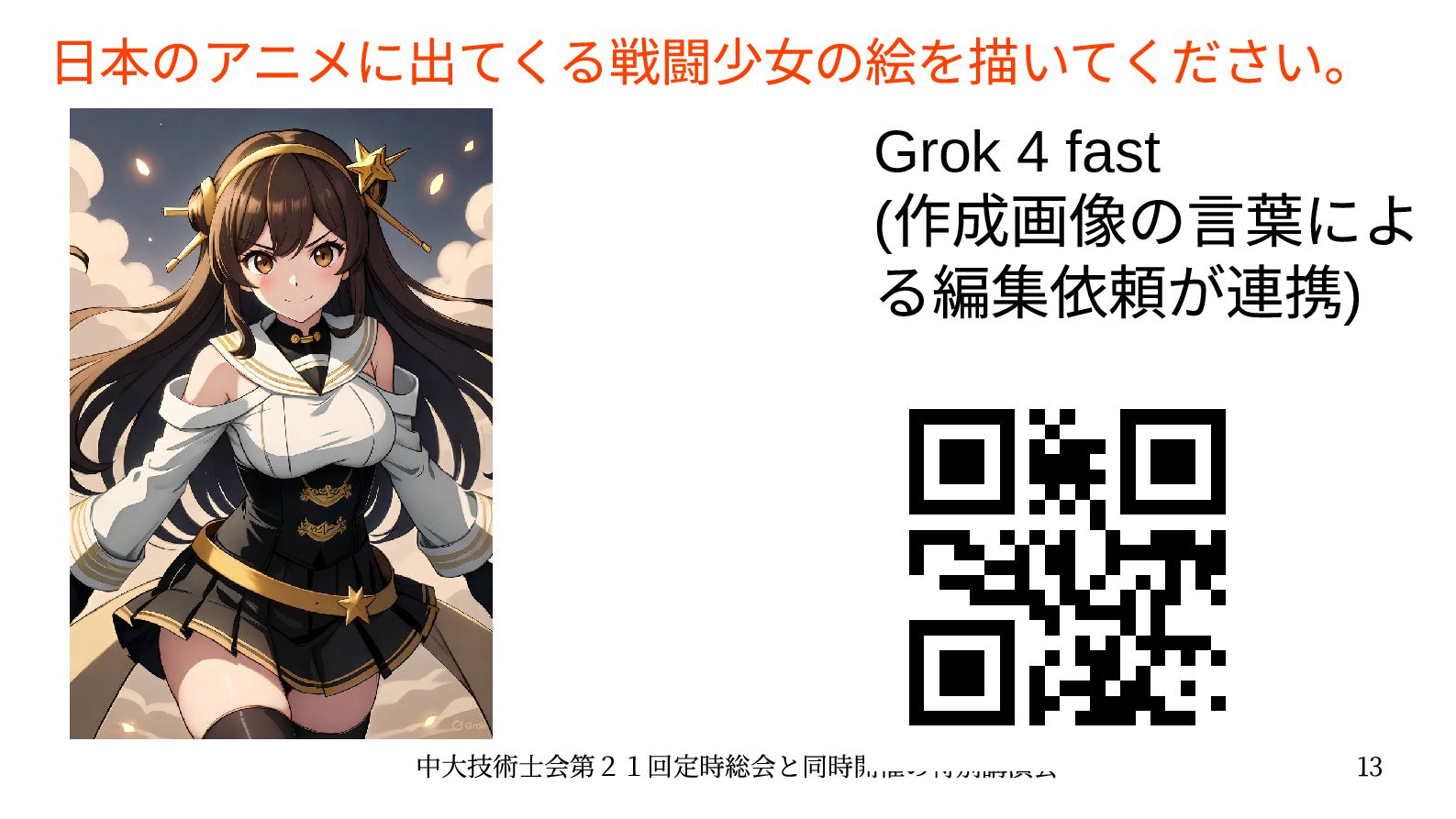 中大技術士会第21回定時総会と同時開催の特別講演会 13 日本のアニメに出てくる戦闘少女の絵を描いてください。 Grok 4 fast ( 作成画像の言葉によ る編集依頼が連携)