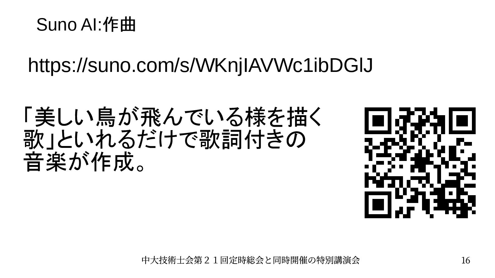中大技術士会第21回定時総会と同時開催の特別講演会 16 Suno AI:作曲 https://suno.com/s/WKnjIAVWc1ibDGlJ 「美しい鳥が飛んでいる様を描く 歌」といれるだけで歌詞付きの 音楽が作成。