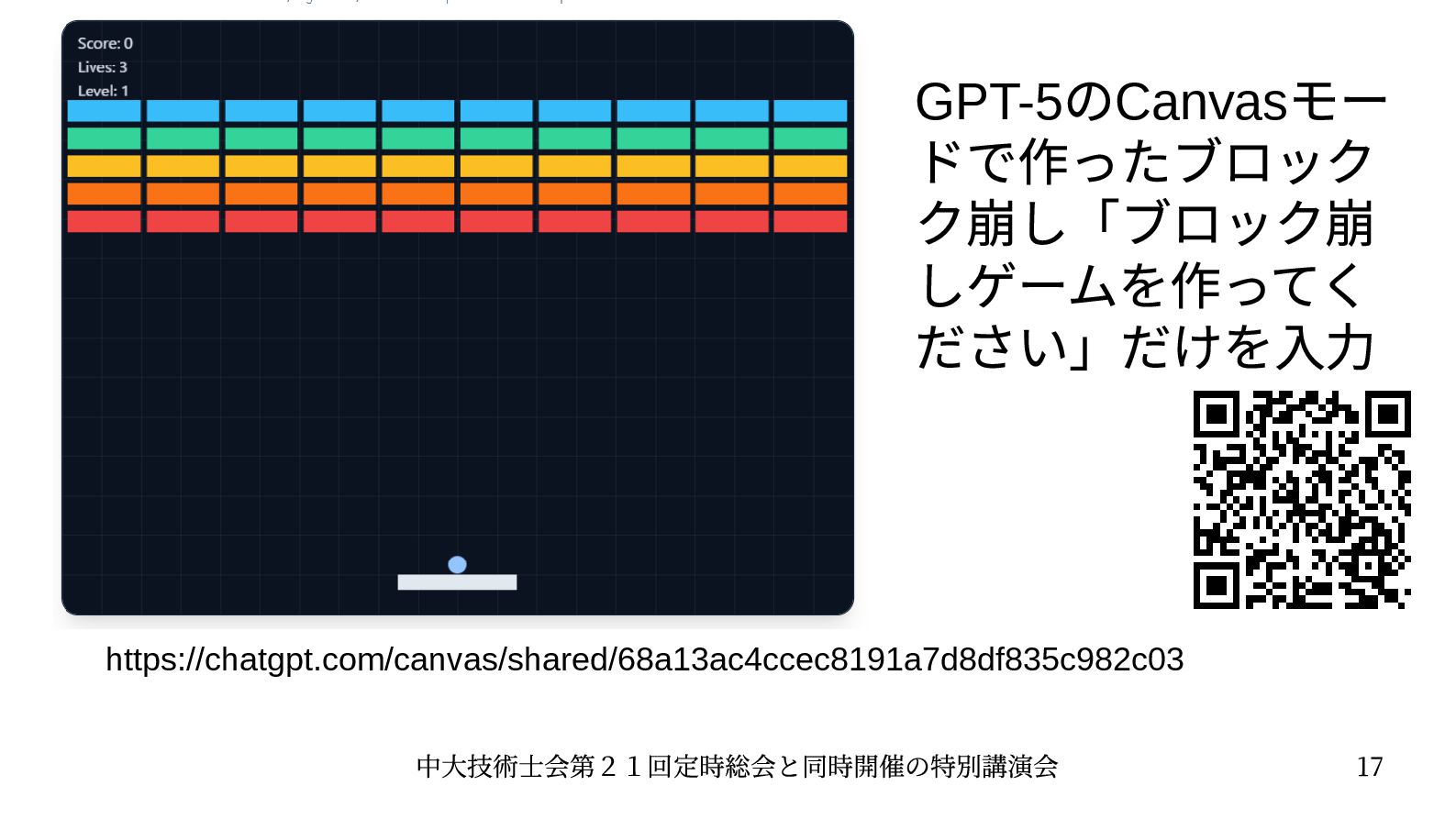 中大技術士会第21回定時総会と同時開催の特別講演会 17 https://chatgpt.com/canvas/shared/68a13ac4ccec8191a7d8df835c982c03 GPT-5 のCanvas モー ドで作ったブロック ク崩し「ブロック崩 しゲームを作ってく ださい」だけを入力