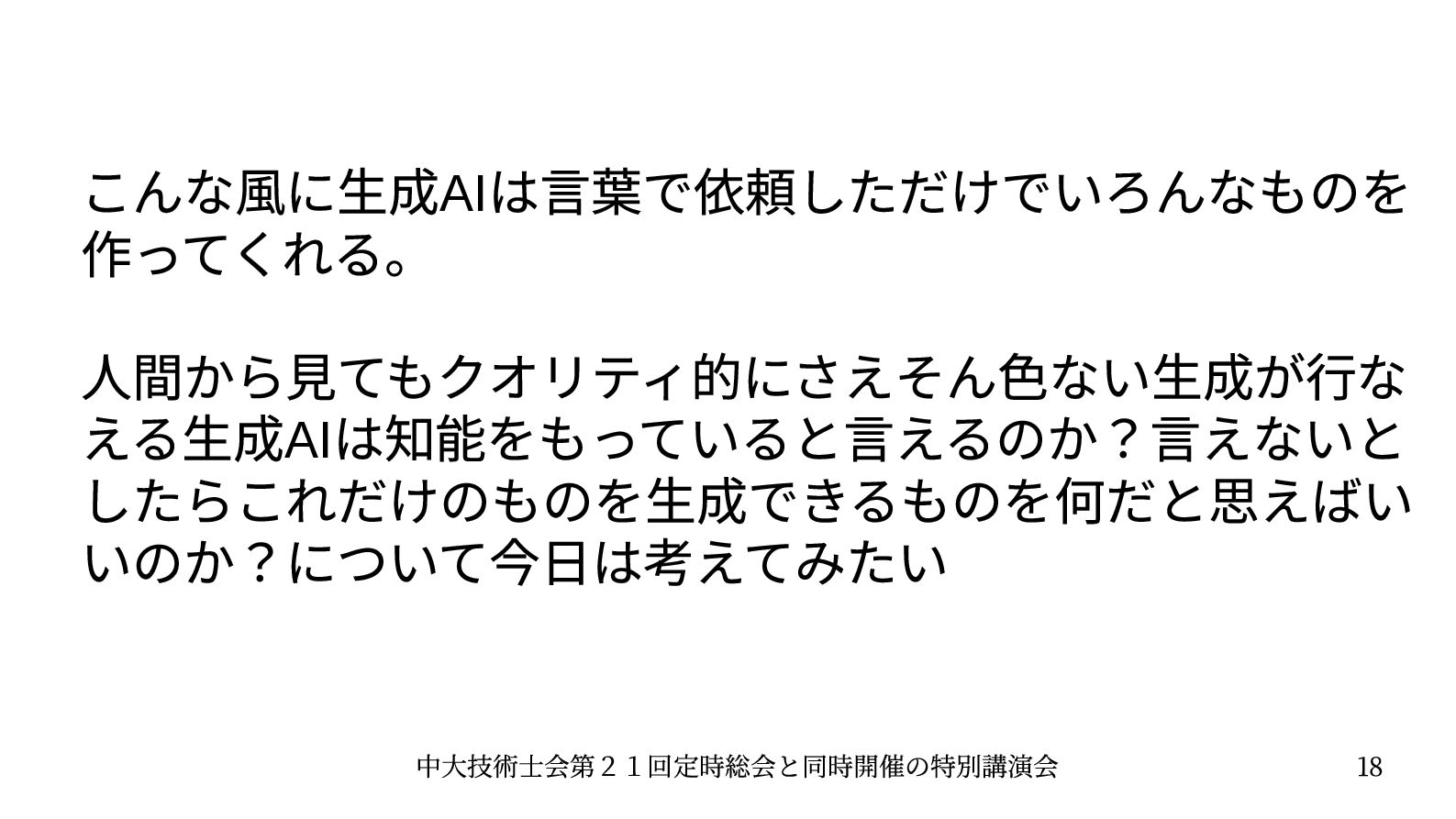 中大技術士会第21回定時総会と同時開催の特別講演会 18 こんな風に生成AI は言葉で依頼しただけでいろんなものを 作ってくれる。 人間から見てもクオリティ的にさえそん色ない生成が行な える生成AI は知能をもっていると言えるのか?言えないと したらこれだけのものを生成できるものを何だと思えばい いのか?について今日は考えてみたい