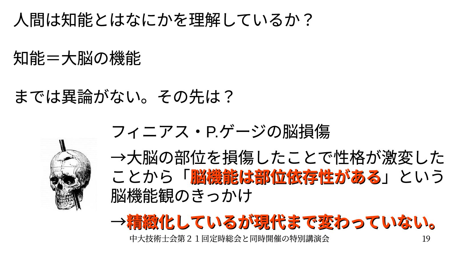 中大技術士会第21回定時総会と同時開催の特別講演会 19 人間は知能とはなにかを理解しているか? 知能=大脳の機能 までは異論がない。その先は? フィニアス・P. ゲージの脳損傷 →大脳の部位を損傷したことで性格が激変した ことから「脳機能は部位依存性がある 脳機能は部位依存性がある」という