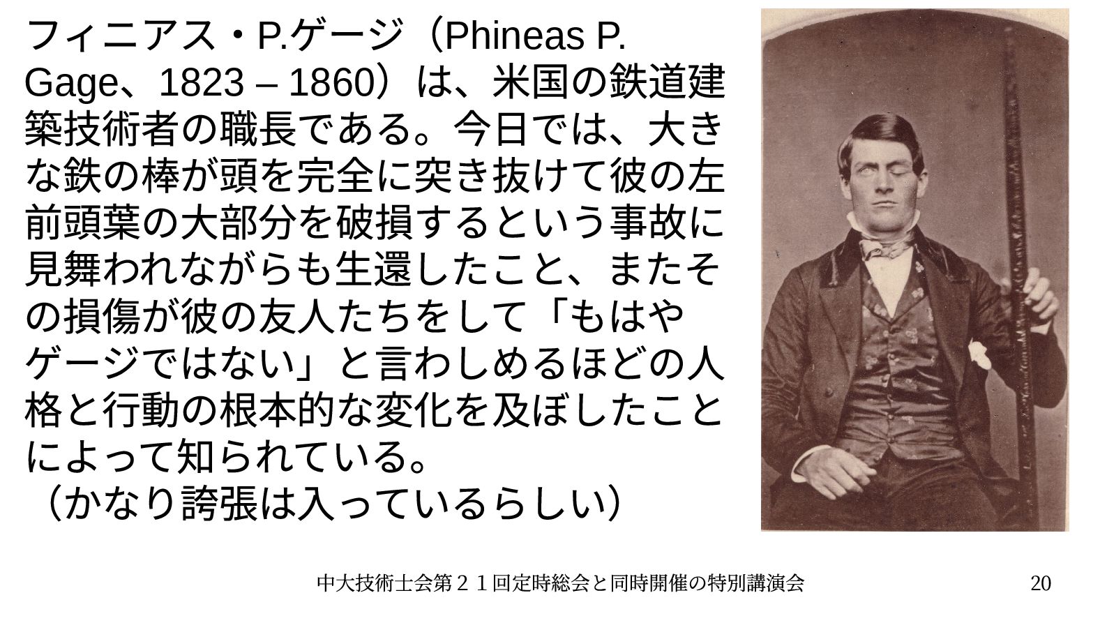 中大技術士会第21回定時総会と同時開催の特別講演会 20 フィニアス・P. ゲージ(Phineas P. Gage 、1823 – 1860 )は、米国の鉄道建