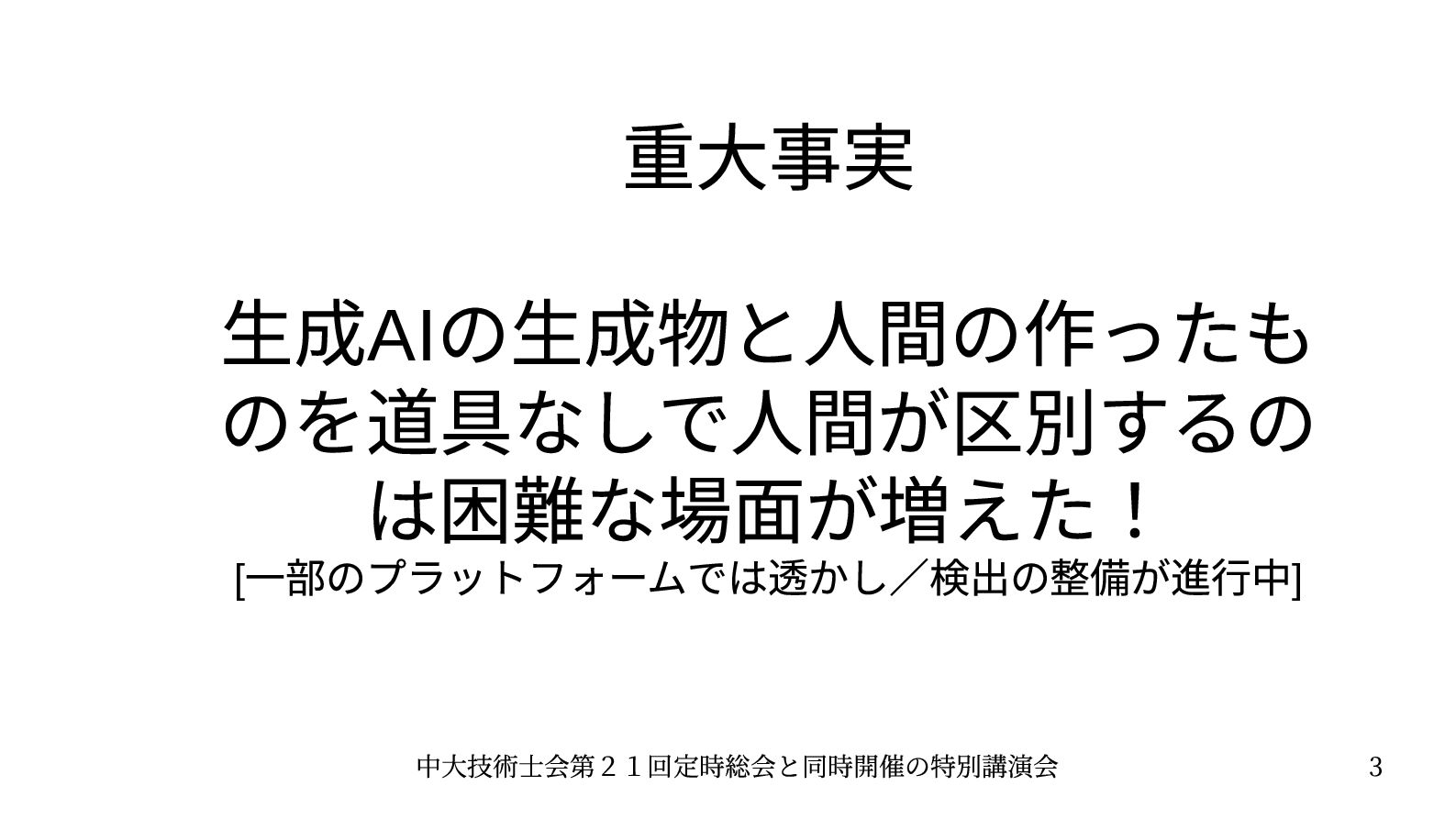 中大技術士会第21回定時総会と同時開催の特別講演会 3 重大事実 生成AI の生成物と人間の作ったも のを道具なしで人間が区別するの は困難な場面が増えた! [ 一部のプラットフォームでは透かし/検出の整備が進行中]