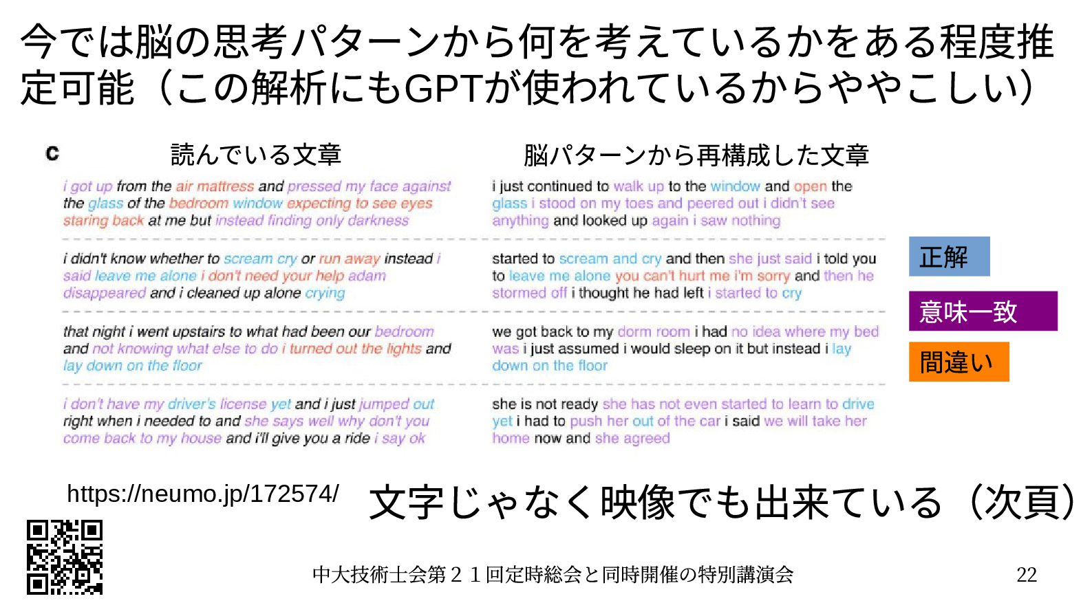中大技術士会第21回定時総会と同時開催の特別講演会 22 今では脳の思考パターンから何を考えているかをある程度推 定可能(この解析にもGPT が使われているからややこしい) https://neumo.jp/172574/ 文字じゃなく映像でも出来ている(次頁) 読んでいる文章 脳パターンから再構成した文章 正解