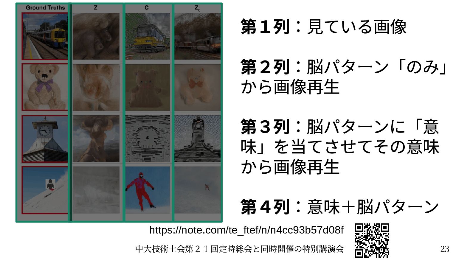 中大技術士会第21回定時総会と同時開催の特別講演会 23 https://note.com/te_ftef/n/n4cc93b57d08f 第1列:見ている画像 第2列:脳パターン「のみ」 から画像再生 第3列:脳パターンに「意 味」を当てさせてその意味 から画像再生 第4列:意味+脳パターン