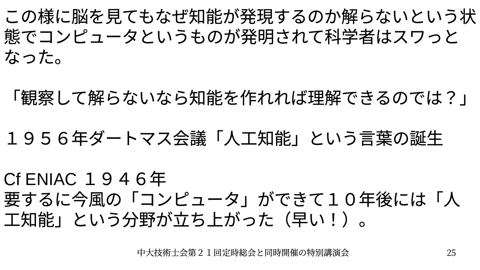中大技術士会第21回定時総会と同時開催の特別講演会 25 この様に脳を見てもなぜ知能が発現するのか解らないという状 態でコンピュータというものが発明されて科学者はスワっと なった。 「観察して解らないなら知能を作れれば理解できるのでは?」 1956年ダートマス会議「人工知能」という言葉の誕生 Cf ENIAC 1946年