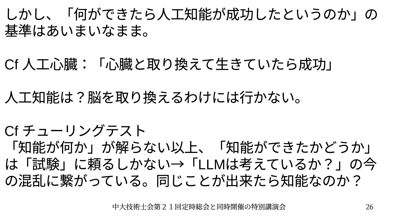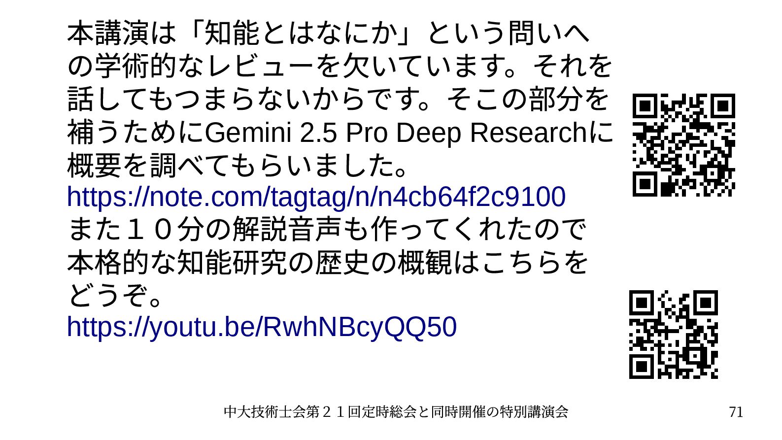 中大技術士会第21回定時総会と同時開催の特別講演会 71 本講演は「知能とはなにか」という問いへ の学術的なレビューを欠いています。それを 話してもつまらないからです。そこの部分を 補うためにGemini 2.5 Pro Deep Research