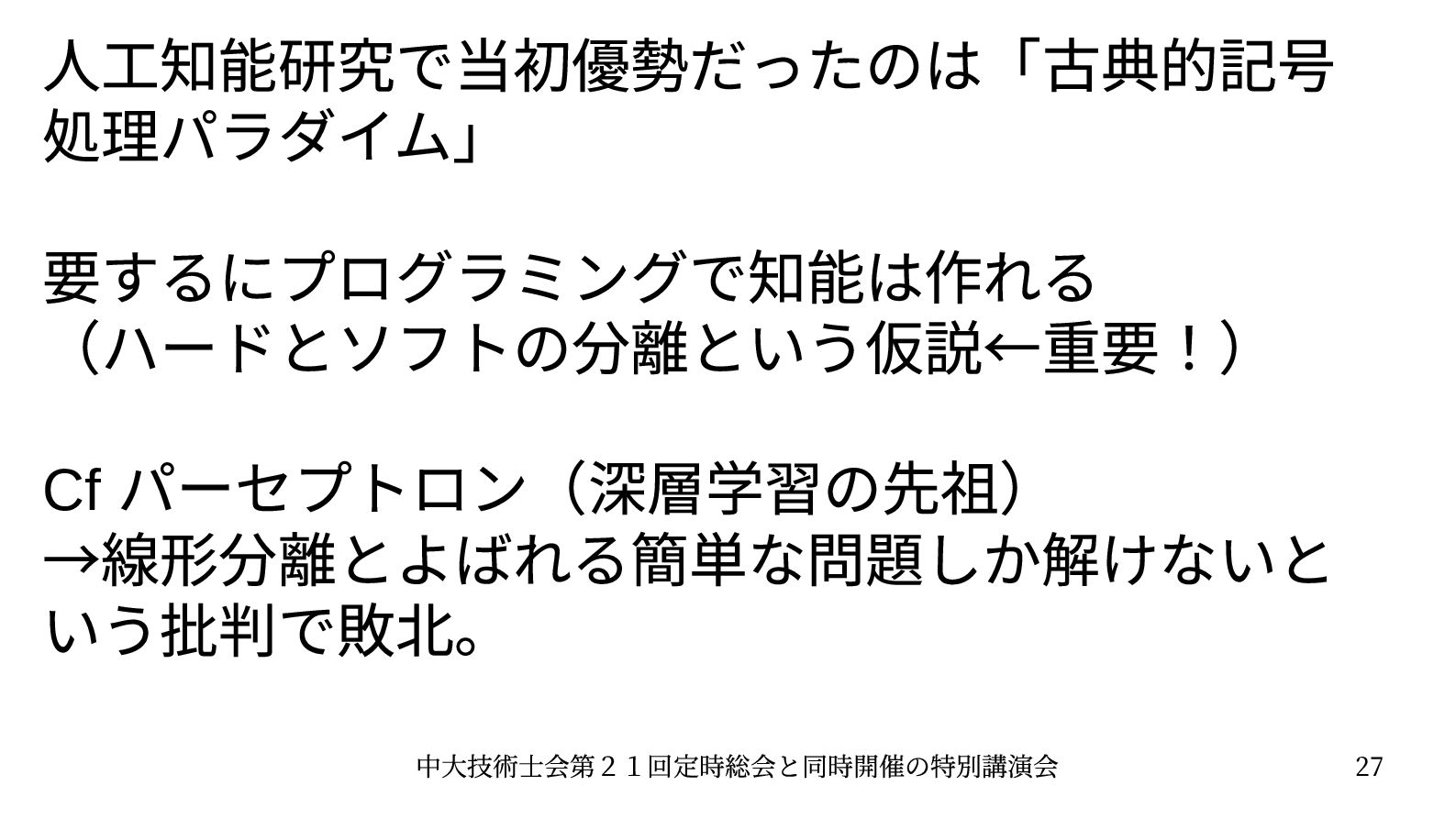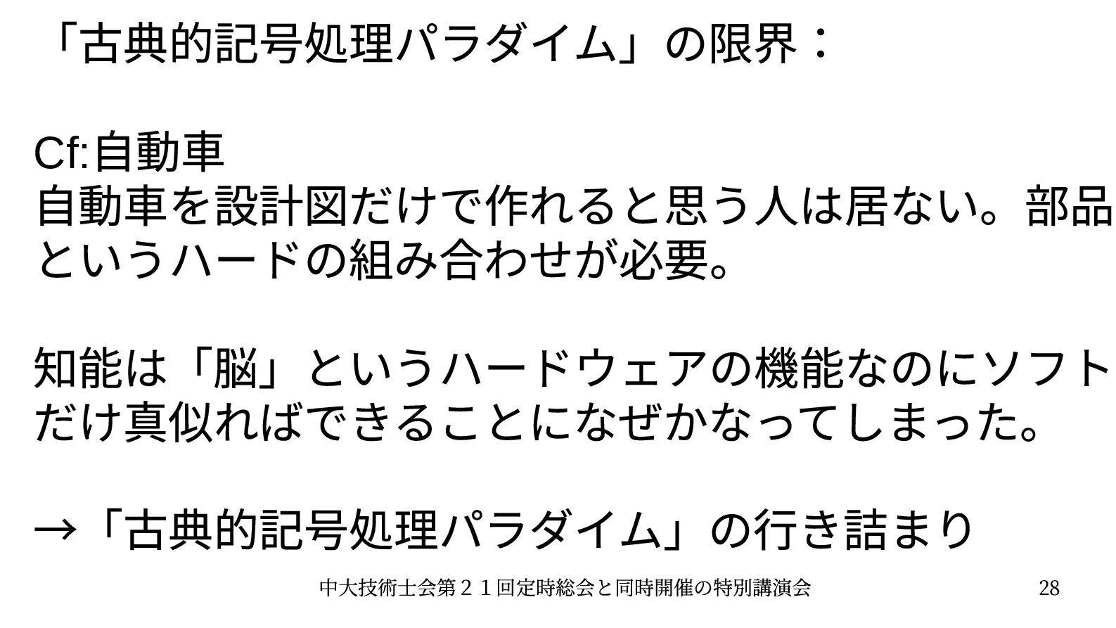 中大技術士会第21回定時総会と同時開催の特別講演会 27 人工知能研究で当初優勢だったのは「古典的記号 処理パラダイム」 要するにプログラミングで知能は作れる (ハードとソフトの分離という仮説←重要!) Cf パーセプトロン(深層学習の先祖) →線形分離とよばれる簡単な問題しか解けないと いう批判で敗北。