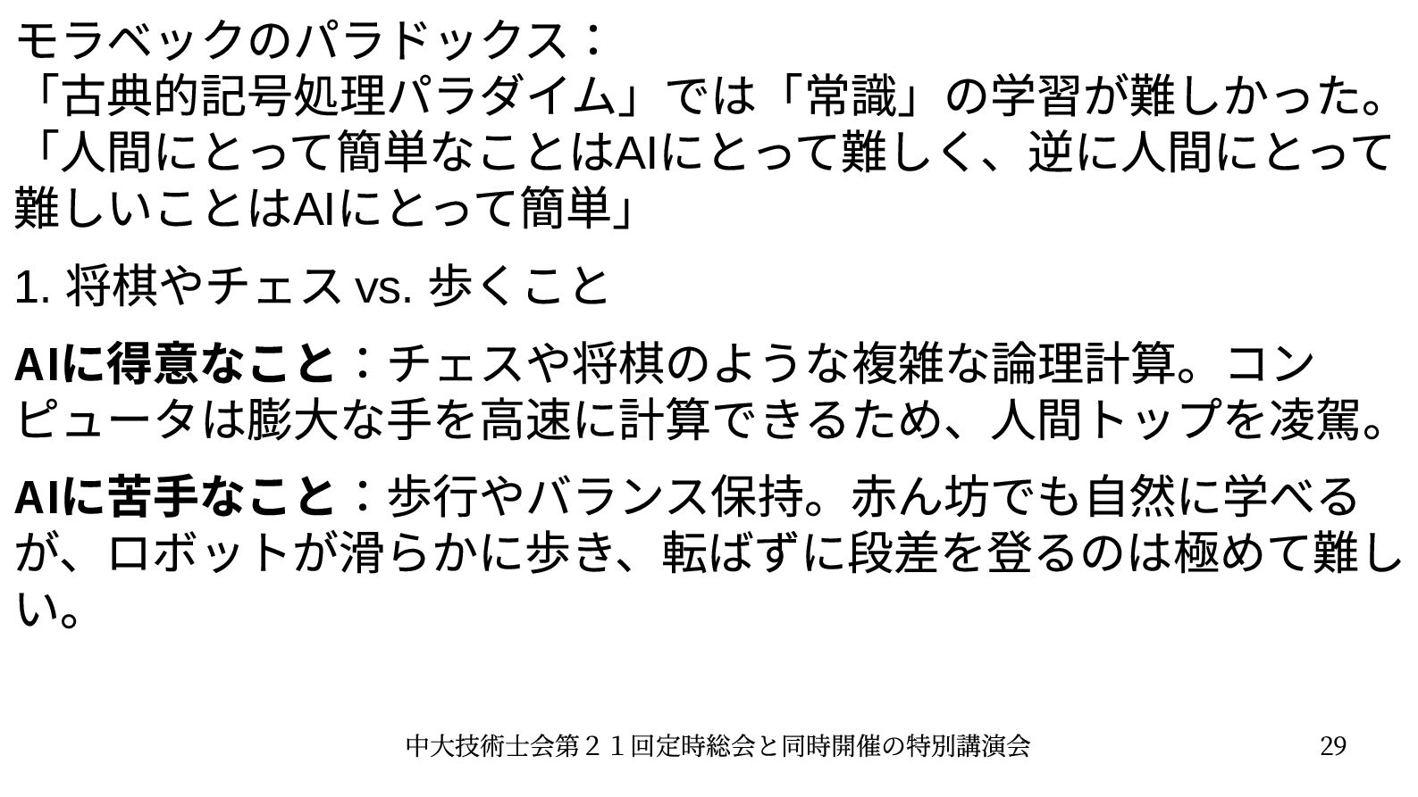 vs. 歩くこと AI に得意なこと:チェスや将棋のような複雑な論理計算。コン ピュータは膨大な手を高速に計算できるため、人間トップを凌駕。 AI に苦手なこと:歩行やバランス保持。赤ん坊でも自然に学べる が、ロボットが滑らかに歩き、転ばずに段差を登るのは極めて難し い。