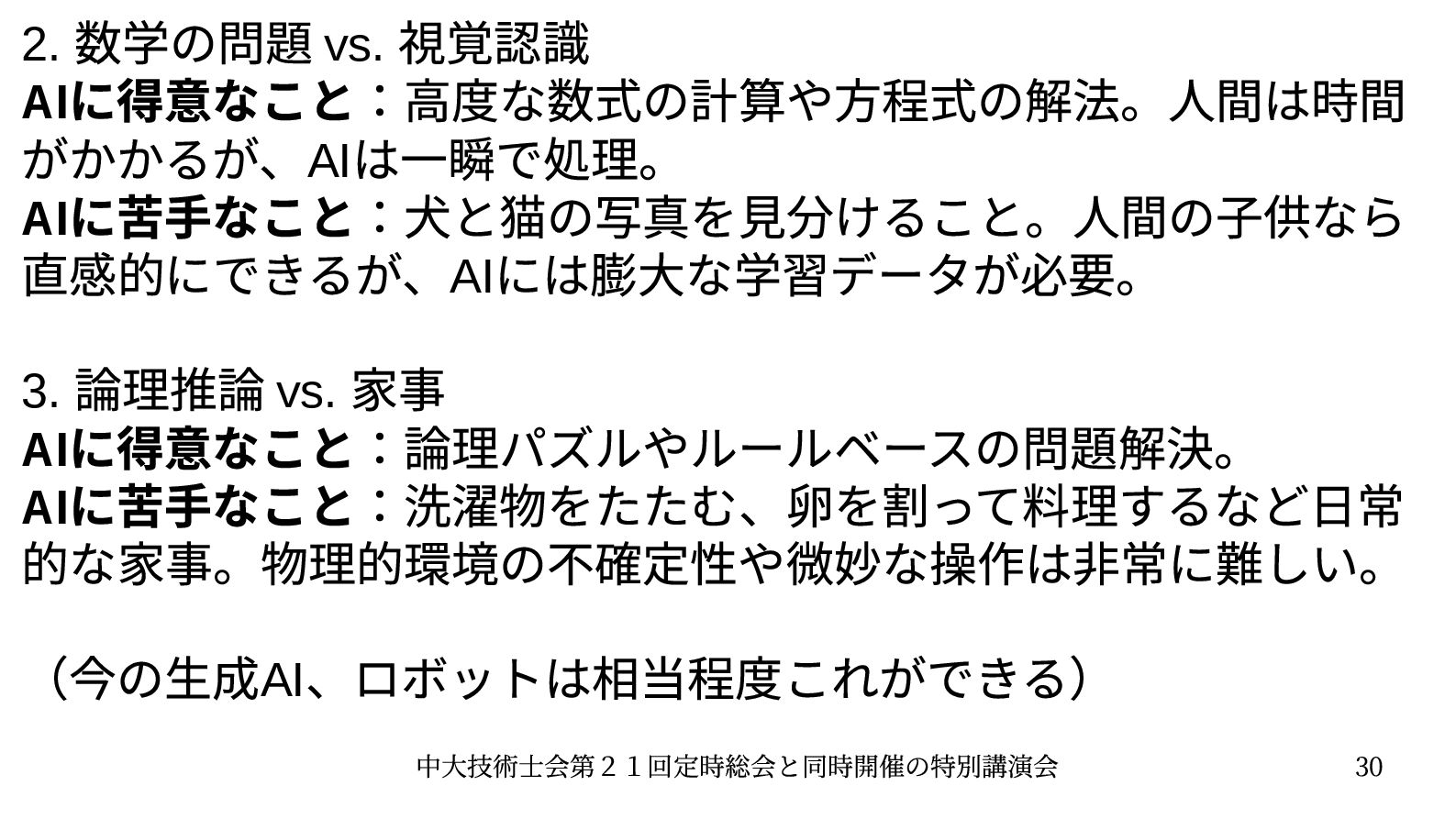AI に苦手なこと:犬と猫の写真を見分けること。人間の子供なら 直感的にできるが、AI には膨大な学習データが必要。 3. 論理推論 vs. 家事 AI に得意なこと:論理パズルやルールベースの問題解決。 AI に苦手なこと:洗濯物をたたむ、卵を割って料理するなど日常 的な家事。物理的環境の不確定性や微妙な操作は非常に難しい。 (今の生成AI 、ロボットは相当程度これができる)