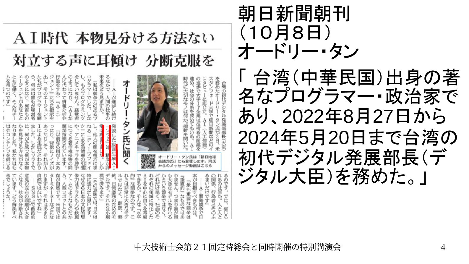 中大技術士会第21回定時総会と同時開催の特別講演会 4 朝日新聞朝刊 (10月8日) オードリー・タン 「 台湾(中華民国)出身の著 名なプログラマー・政治家で あり、2022年8月27日から 2024年5月20日まで台湾の