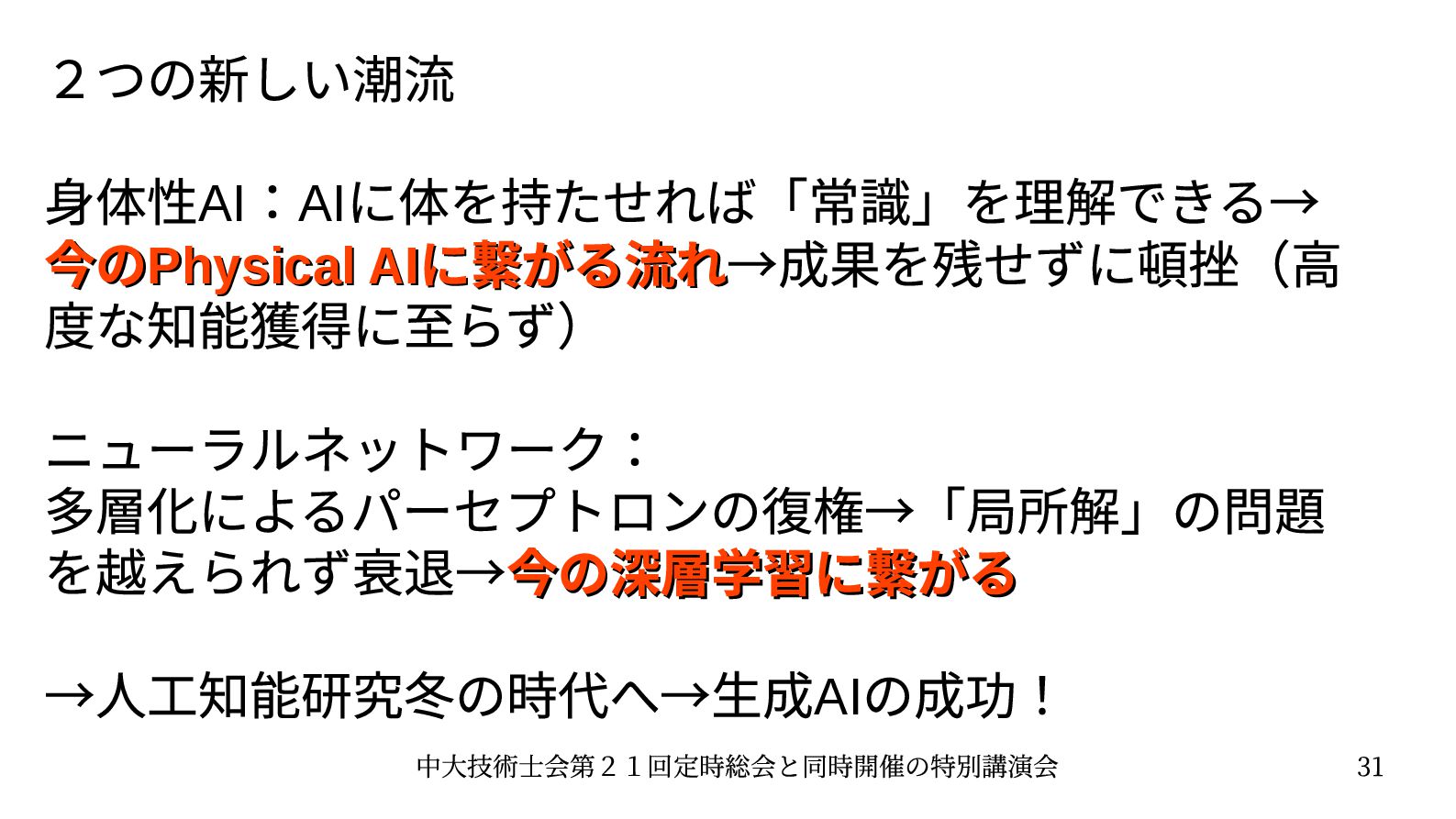 中大技術士会第21回定時総会と同時開催の特別講演会 31 2つの新しい潮流 身体性AI :AI に体を持たせれば「常識」を理解できる→ 今の 今のPhysical AI Physical