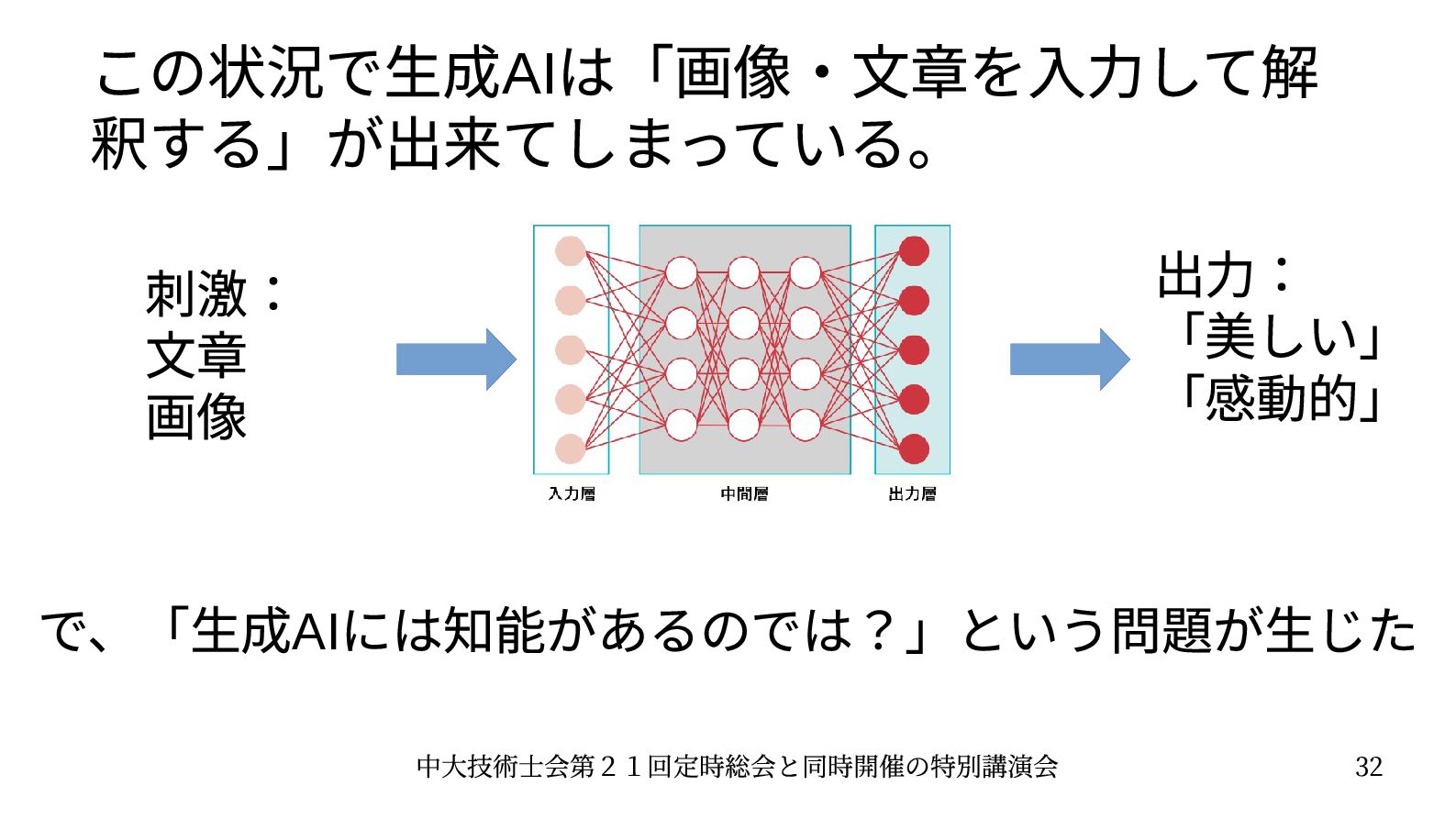 中大技術士会第21回定時総会と同時開催の特別講演会 32 この状況で生成AI は「画像・文章を入力して解 釈する」が出来てしまっている。 刺激: 文章 画像 出力: 「美しい」