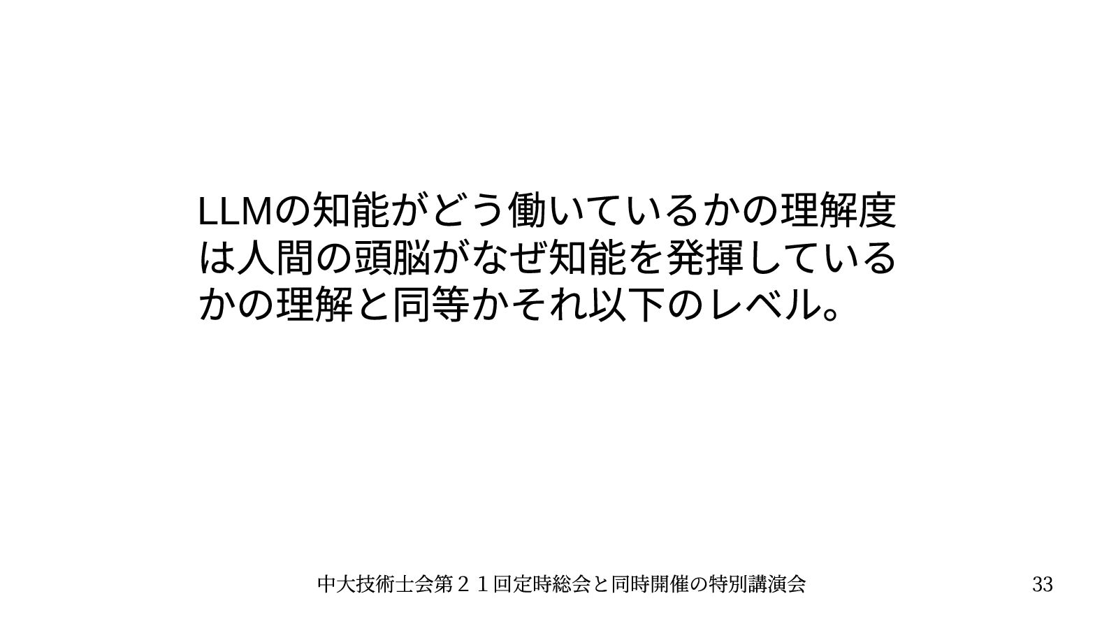 中大技術士会第21回定時総会と同時開催の特別講演会 33 LLM の知能がどう働いているかの理解度 は人間の頭脳がなぜ知能を発揮している かの理解と同等かそれ以下のレベル。