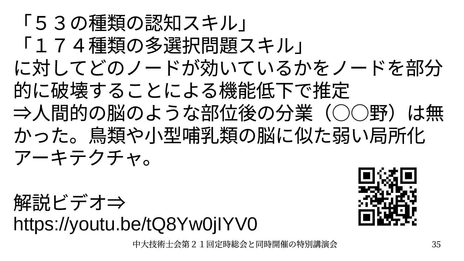 中大技術士会第21回定時総会と同時開催の特別講演会 35 「53の種類の認知スキル」 「174種類の多選択問題スキル」 に対してどのノードが効いているかをノードを部分 的に破壊することによる機能低下で推定 ⇒人間的の脳のような部位後の分業(◦◦野)は無 かった。鳥類や小型哺乳類の脳に似た弱い局所化 アーキテクチャ。 解説ビデオ⇒