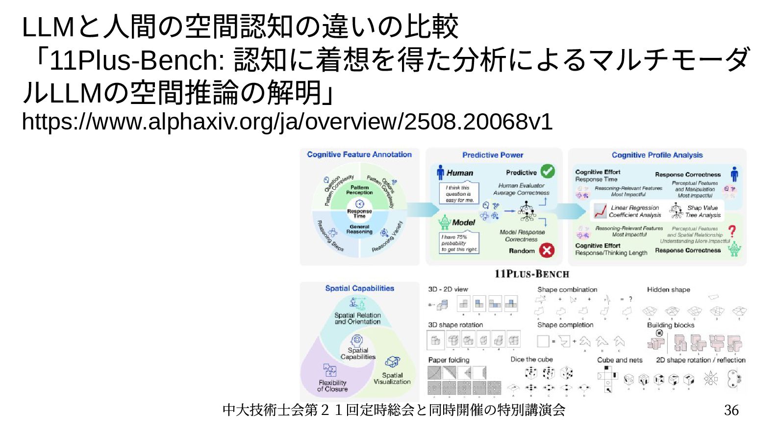 中大技術士会第21回定時総会と同時開催の特別講演会 36 LLM と人間の空間認知の違いの比較 「11Plus-Bench: 認知に着想を得た分析によるマルチモーダ ルLLM の空間推論の解明」 https://www.alphaxiv.org/ja/overview/2508.20068v1