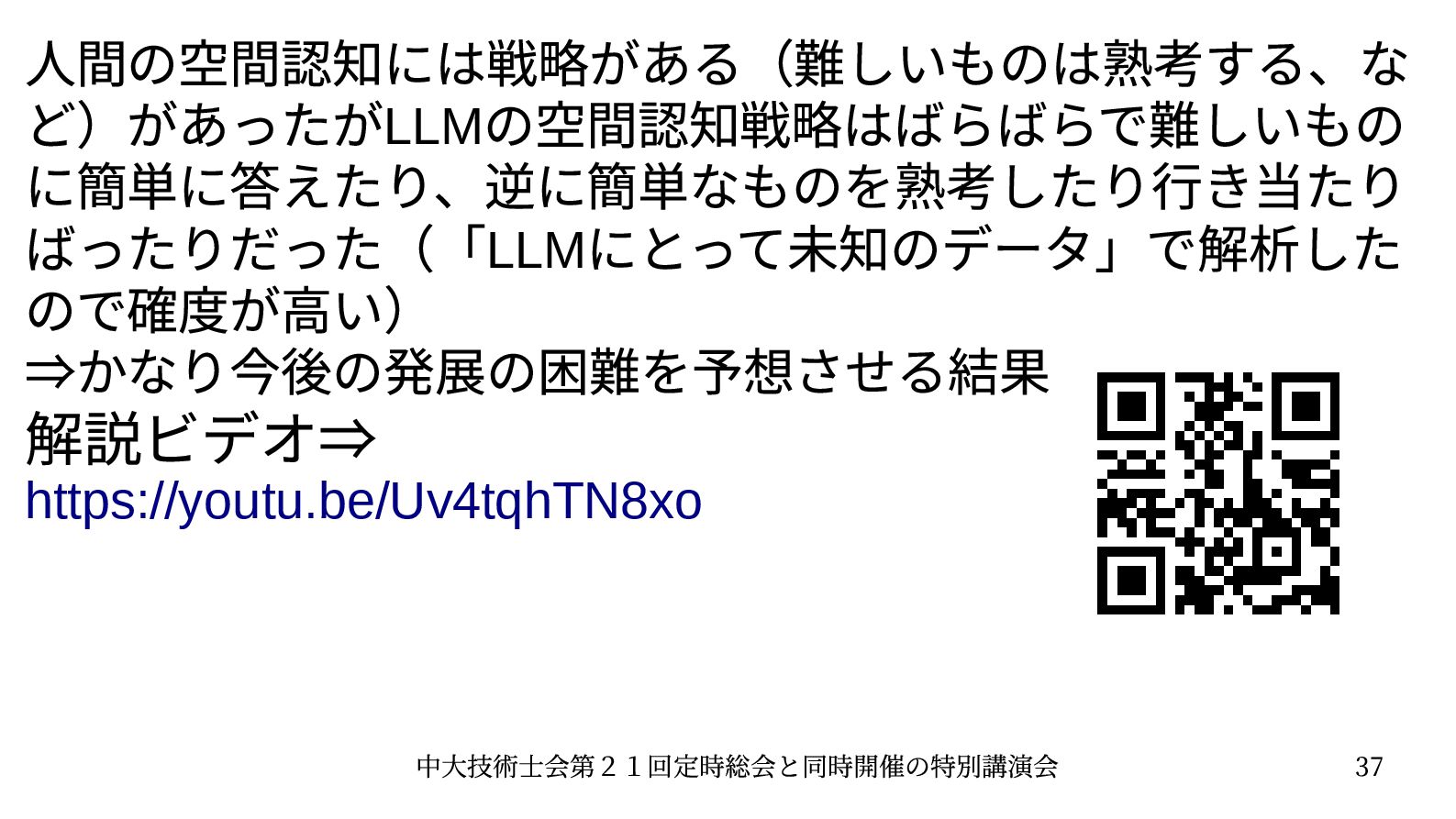 中大技術士会第21回定時総会と同時開催の特別講演会 37 人間の空間認知には戦略がある(難しいものは熟考する、な ど)があったがLLM の空間認知戦略はばらばらで難しいもの に簡単に答えたり、逆に簡単なものを熟考したり行き当たり ばったりだった(「LLM にとって未知のデータ」で解析した ので確度が高い) ⇒かなり今後の発展の困難を予想させる結果