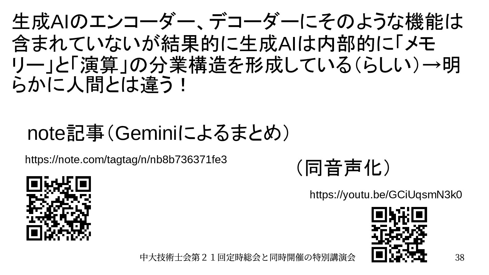 中大技術士会第21回定時総会と同時開催の特別講演会 38 生成AIのエンコーダー、デコーダーにそのような機能は 含まれていないが結果的に生成AIは内部的に「メモ リー」と「演算」の分業構造を形成している(らしい)→明 らかに人間とは違う! https://note.com/tagtag/n/nb8b736371fe3 note記事(Geminiによるまとめ) https://youtu.be/GCiUqsmN3k0 (同音声化)