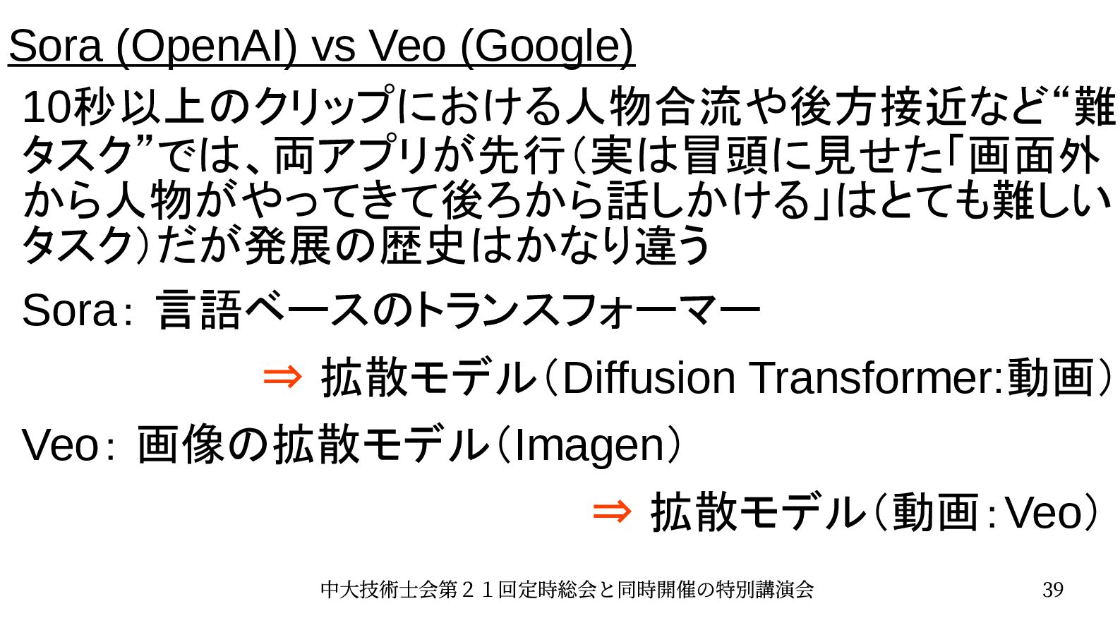 中大技術士会第21回定時総会と同時開催の特別講演会 39 Sora (OpenAI) vs Veo (Google) 10秒以上のクリップにおける人物合流や後方接近など“難 タスク”では、両アプリが先行(実は冒頭に見せた「画面外 から人物がやってきて後ろから話しかける」はとても難しい