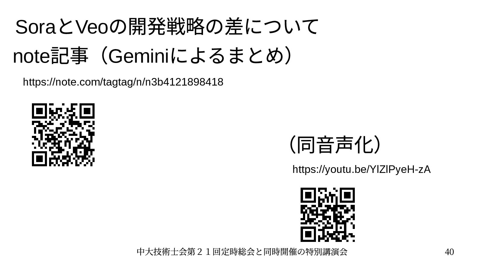 中大技術士会第21回定時総会と同時開催の特別講演会 40 note 記事(Gemini によるまとめ) (同音声化) Sora とVeo の開発戦略の差について https://note.com/tagtag/n/n3b4121898418