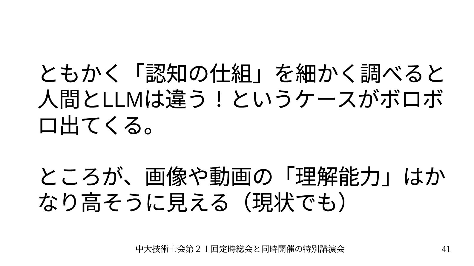 中大技術士会第21回定時総会と同時開催の特別講演会 41 ともかく「認知の仕組」を細かく調べると 人間とLLM は違う!というケースがボロボ ロ出てくる。 ところが、画像や動画の「理解能力」はか なり高そうに見える(現状でも)