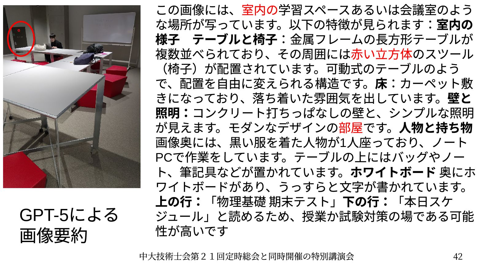 が見えます。モダンなデザインの部屋です。人物と持ち物 画像奥には、黒い服を着た人物が1 人座っており、ノート PC で作業をしています。テーブルの上にはバッグやノー ト、筆記具などが置かれています。ホワイトボード 奥にホ ワイトボードがあり、うっすらと文字が書かれています。 上の行:「物理基礎 期末テスト」下の行:「本日スケ ジュール」と読めるため、授業か試験対策の場である可能 性が高いです GPT-5 による 画像要約