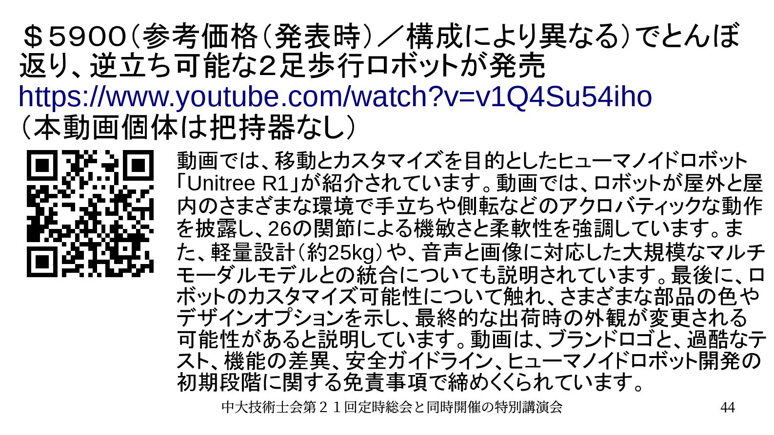 中大技術士会第21回定時総会と同時開催の特別講演会 44 $5900(参考価格(発表時)/構成により異なる)でとんぼ 返り、逆立ち可能な2足歩行ロボットが発売 https://www.youtube.com/watch?v=v1Q4Su54iho (本動画個体は把持器なし) 動画では、移動とカスタマイズを目的としたヒューマノイドロボット 「Unitree R1」が紹介されています。動画では、ロボットが屋外と屋 内のさまざまな環境で手立ちや側転などのアクロバティックな動作