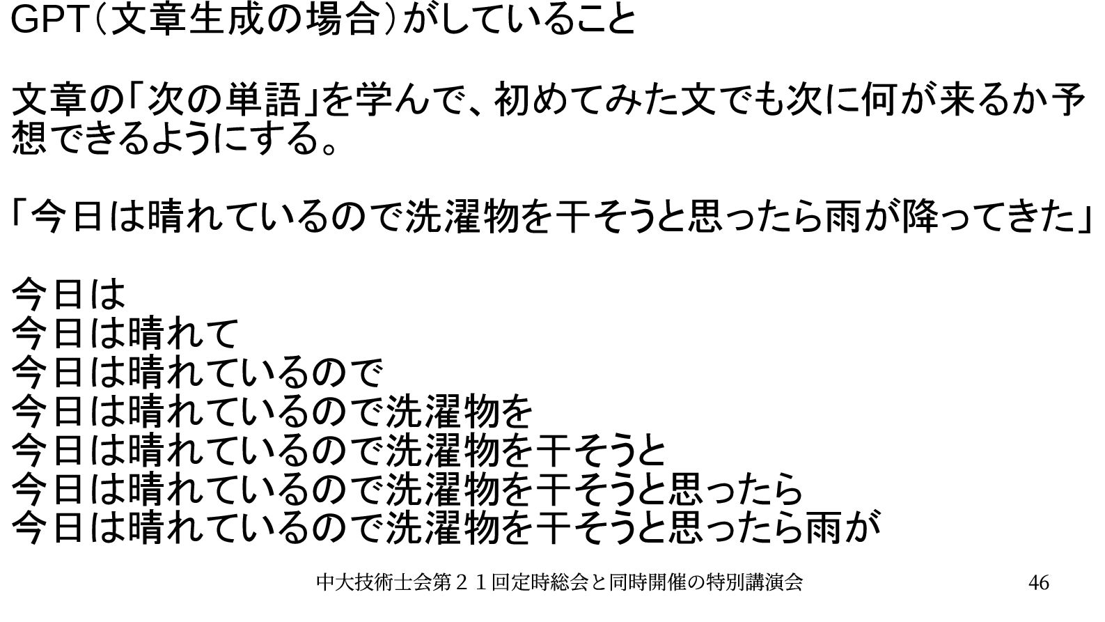 中大技術士会第21回定時総会と同時開催の特別講演会 46 GPT(文章生成の場合)がしていること 文章の「次の単語」を学んで、初めてみた文でも次に何が来るか予 想できるようにする。 「今日は晴れているので洗濯物を干そうと思ったら雨が降ってきた」 今日は 今日は晴れて 今日は晴れているので 今日は晴れているので洗濯物を