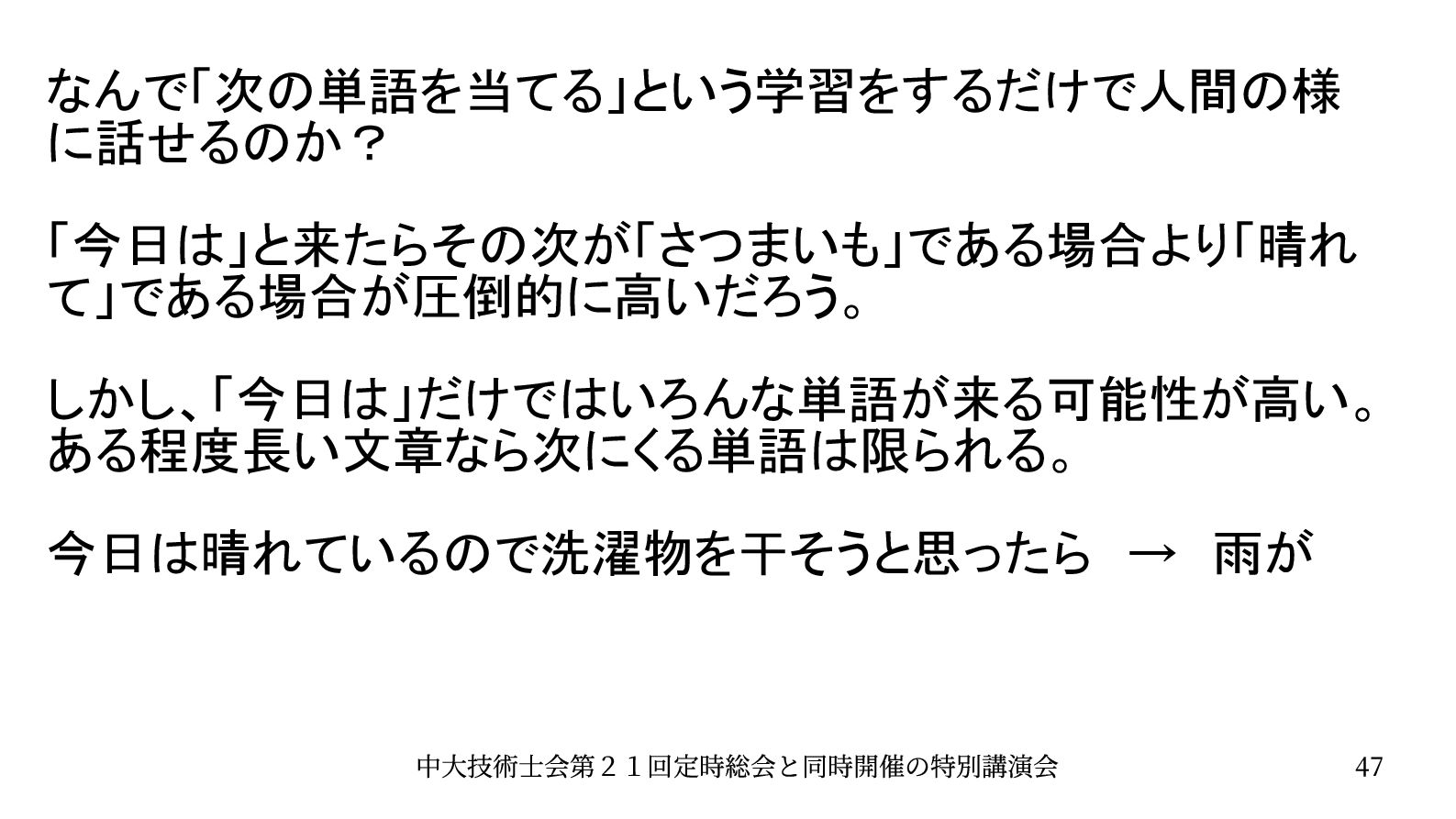 中大技術士会第21回定時総会と同時開催の特別講演会 47 なんで「次の単語を当てる」という学習をするだけで人間の様 に話せるのか? 「今日は」と来たらその次が「さつまいも」である場合より「晴れ て」である場合が圧倒的に高いだろう。 しかし、「今日は」だけではいろんな単語が来る可能性が高い。 ある程度長い文章なら次にくる単語は限られる。 今日は晴れているので洗濯物を干そうと思ったら → 雨が