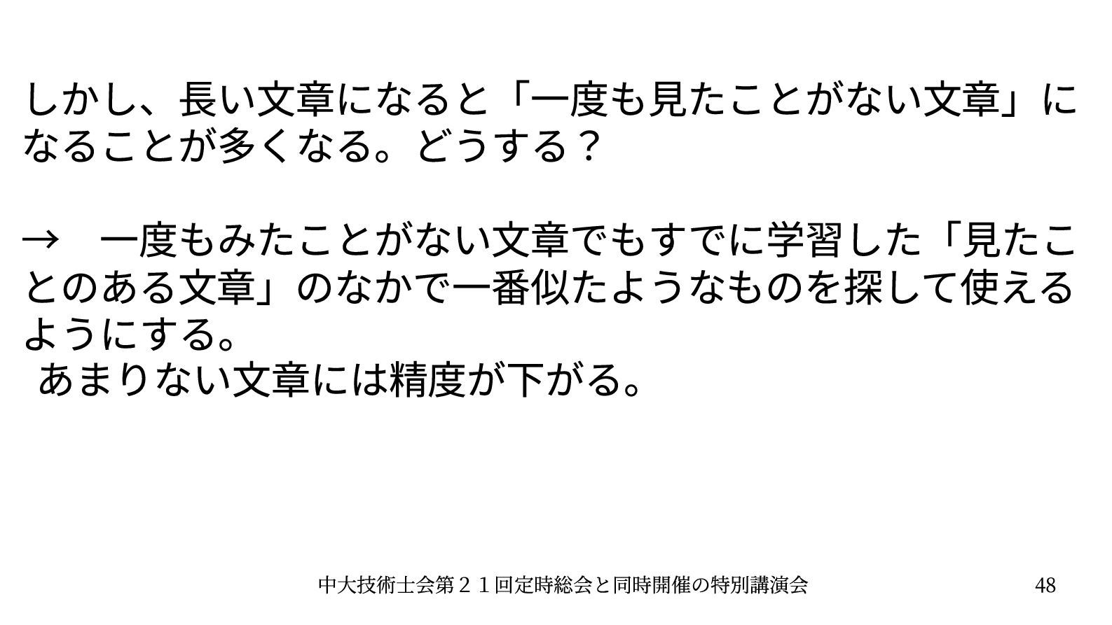 中大技術士会第21回定時総会と同時開催の特別講演会 48 しかし、長い文章になると「一度も見たことがない文章」に なることが多くなる。どうする? → 一度もみたことがない文章でもすでに学習した「見たこ とのある文章」のなかで一番似たようなものを探して使える ようにする。 あまりない文章には精度が下がる。