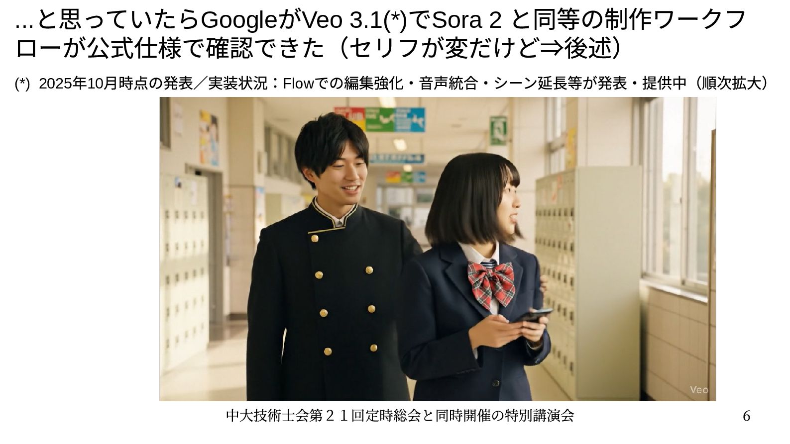 中大技術士会第21回定時総会と同時開催の特別講演会 5 「女子高校生が正面を向いて立っている。その背 後に男子高校生が画面外からフレームインして女 子高校生に背後から話しかける。」 Sora 2