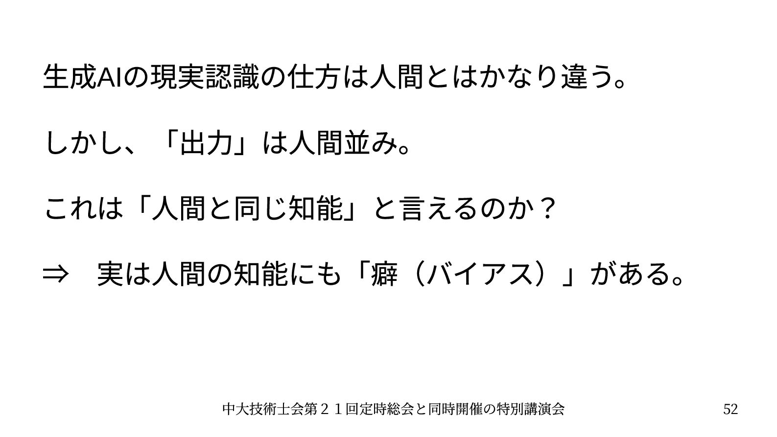 中大技術士会第21回定時総会と同時開催の特別講演会 52 生成AI の現実認識の仕方は人間とはかなり違う。 しかし、「出力」は人間並み。 これは「人間と同じ知能」と言えるのか? ⇒ 実は人間の知能にも「癖(バイアス)」がある。
