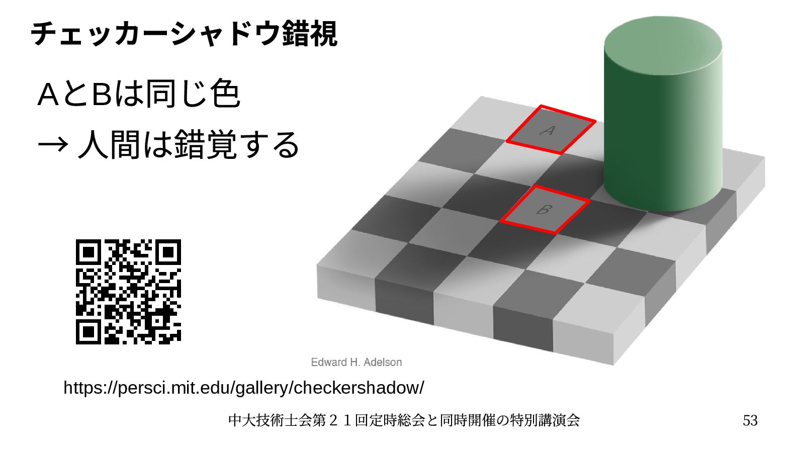 中大技術士会第21回定時総会と同時開催の特別講演会 53 チェッカーシャドウ錯視 A とB は同じ色 → 人間は錯覚する https://persci.mit.edu/gallery/checkershadow/