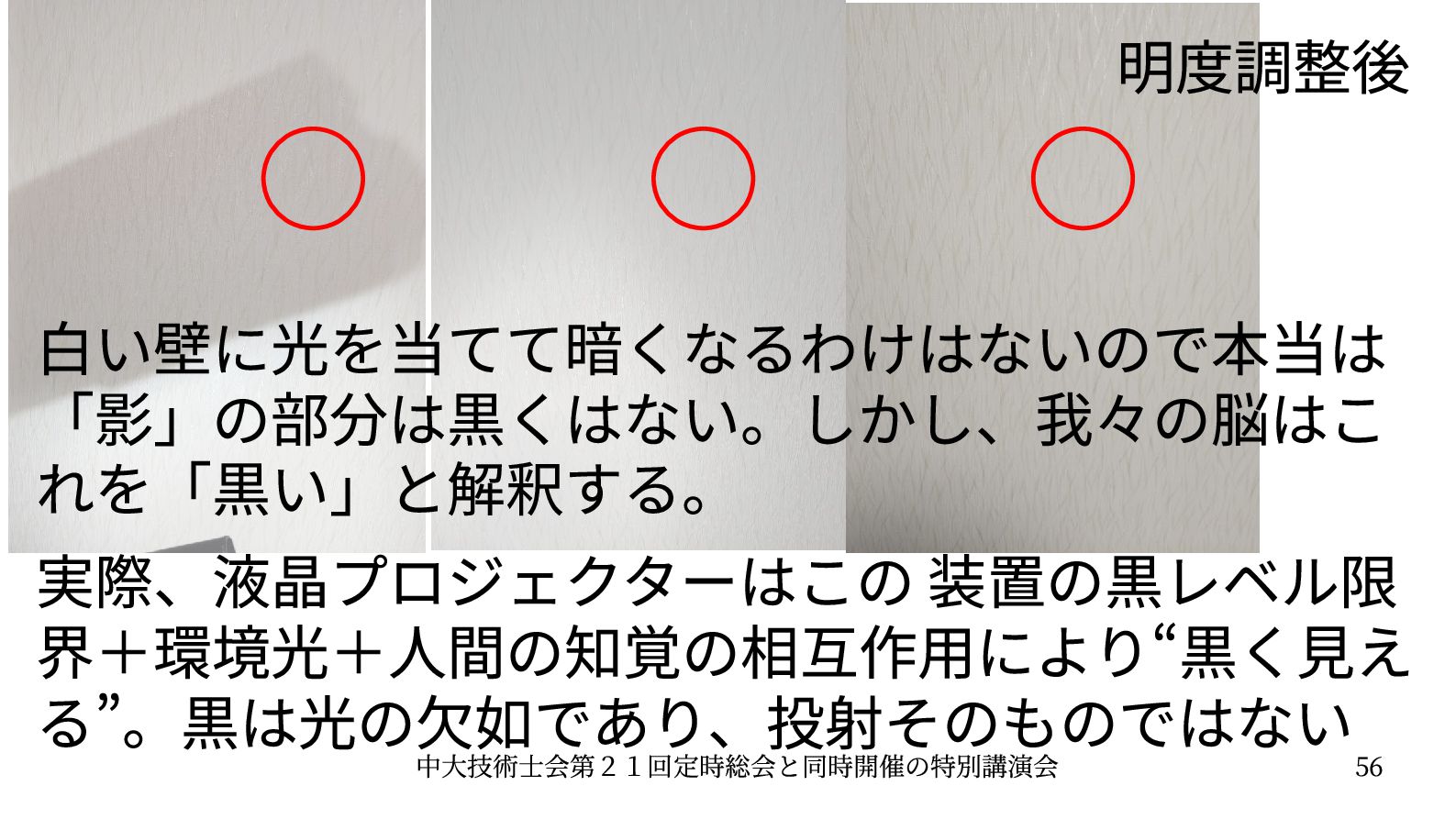 中大技術士会第21回定時総会と同時開催の特別講演会 56 白い壁に光を当てて暗くなるわけはないので本当は 「影」の部分は黒くはない。しかし、我々の脳はこ れを「黒い」と解釈する。 実際、液晶プロジェクターはこの 装置の黒レベル限 界+環境光+人間の知覚の相互作用により“黒く見え る”。黒は光の欠如であり、投射そのものではない 明度調整後