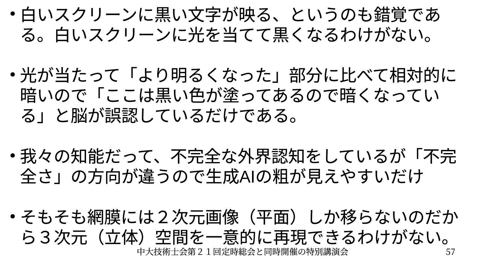 中大技術士会第21回定時総会と同時開催の特別講演会 57 • 白いスクリーンに黒い文字が映る、というのも錯覚であ る。白いスクリーンに光を当てて黒くなるわけがない。 • 光が当たって「より明るくなった」部分に比べて相対的に 暗いので「ここは黒い色が塗ってあるので暗くなってい る」と脳が誤認しているだけである。 •