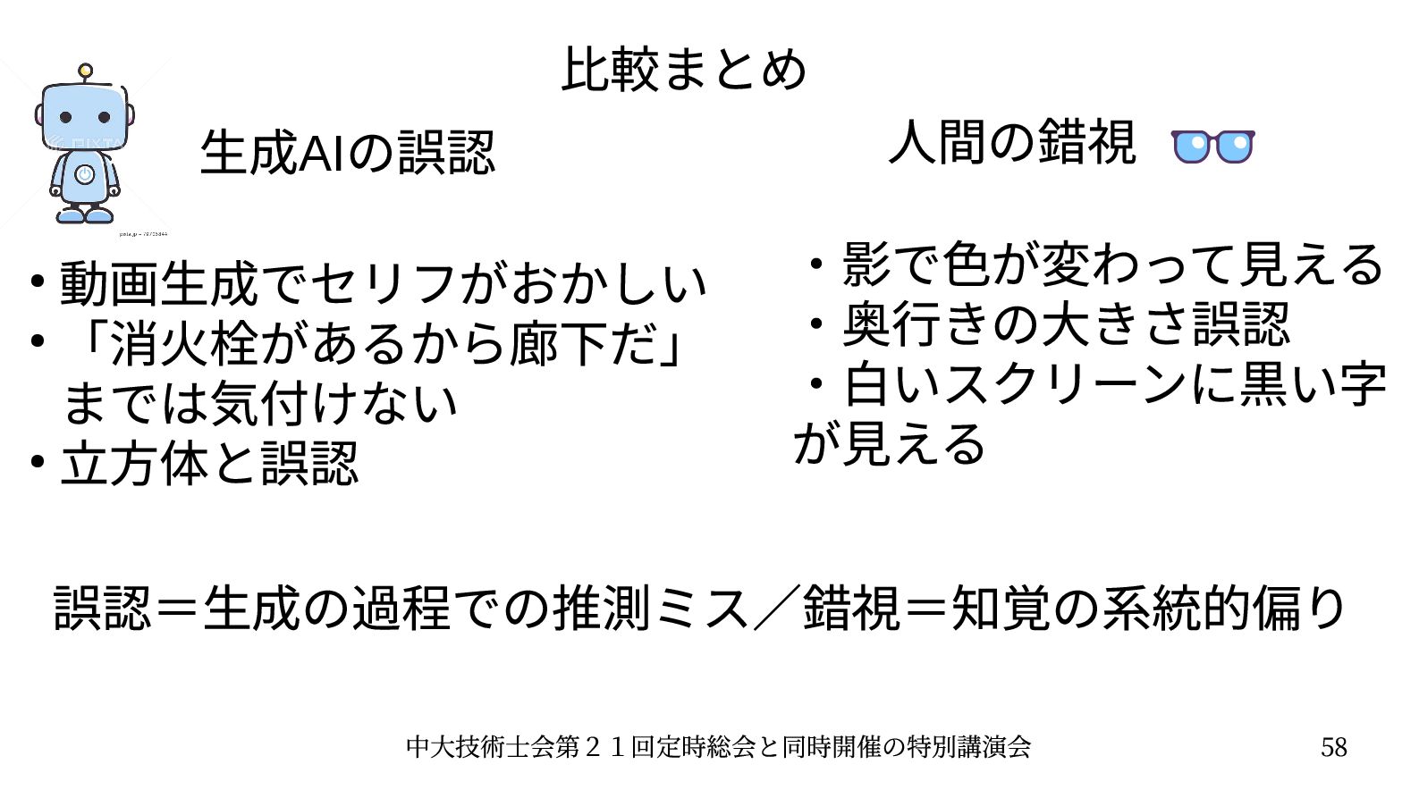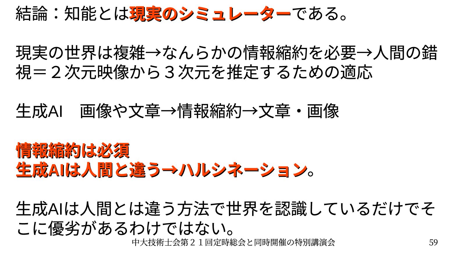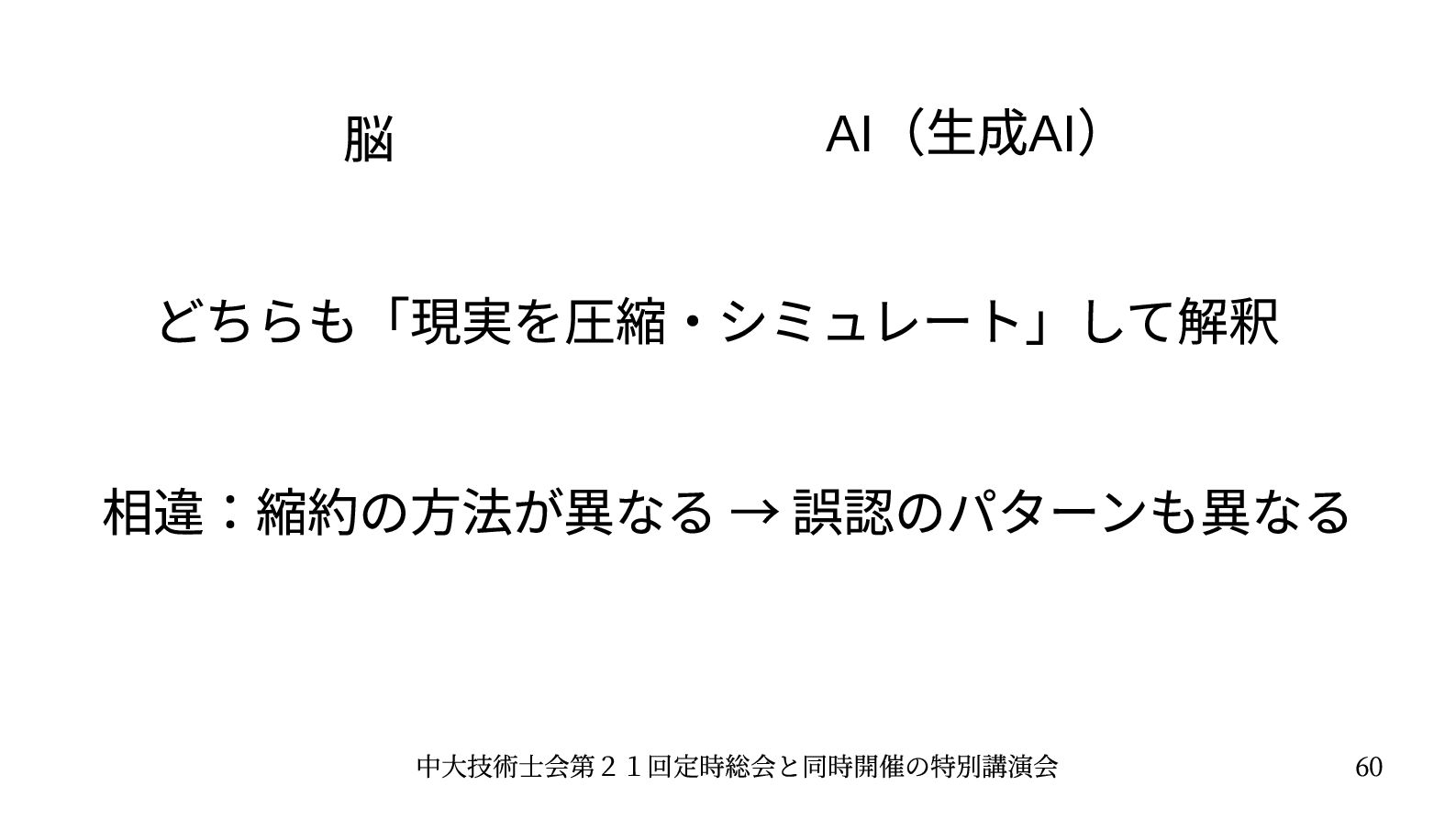 中大技術士会第21回定時総会と同時開催の特別講演会 60 脳 AI (生成AI ) どちらも「現実を圧縮・シミュレート」して解釈 相違:縮約の方法が異なる → 誤認のパターンも異なる