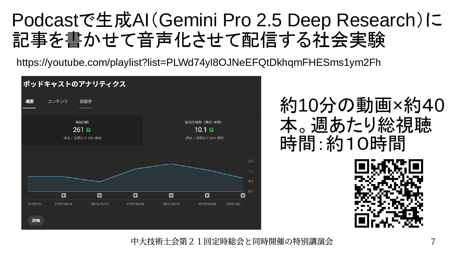 中大技術士会第21回定時総会と同時開催の特別講演会 7 Podcastで生成AI(Gemini Pro 2.5 Deep Research)に 記事を書かせて音声化させて配信する社会実験 約10分の動画×約40 本。週あたり総視聴