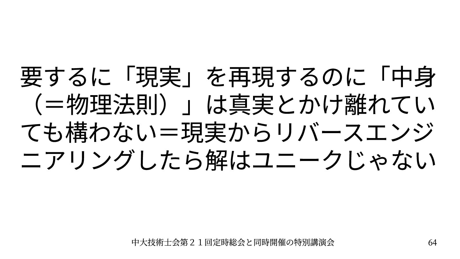 中大技術士会第21回定時総会と同時開催の特別講演会 64 要するに「現実」を再現するのに「中身 (=物理法則)」は真実とかけ離れてい ても構わない=現実からリバースエンジ ニアリングしたら解はユニークじゃない