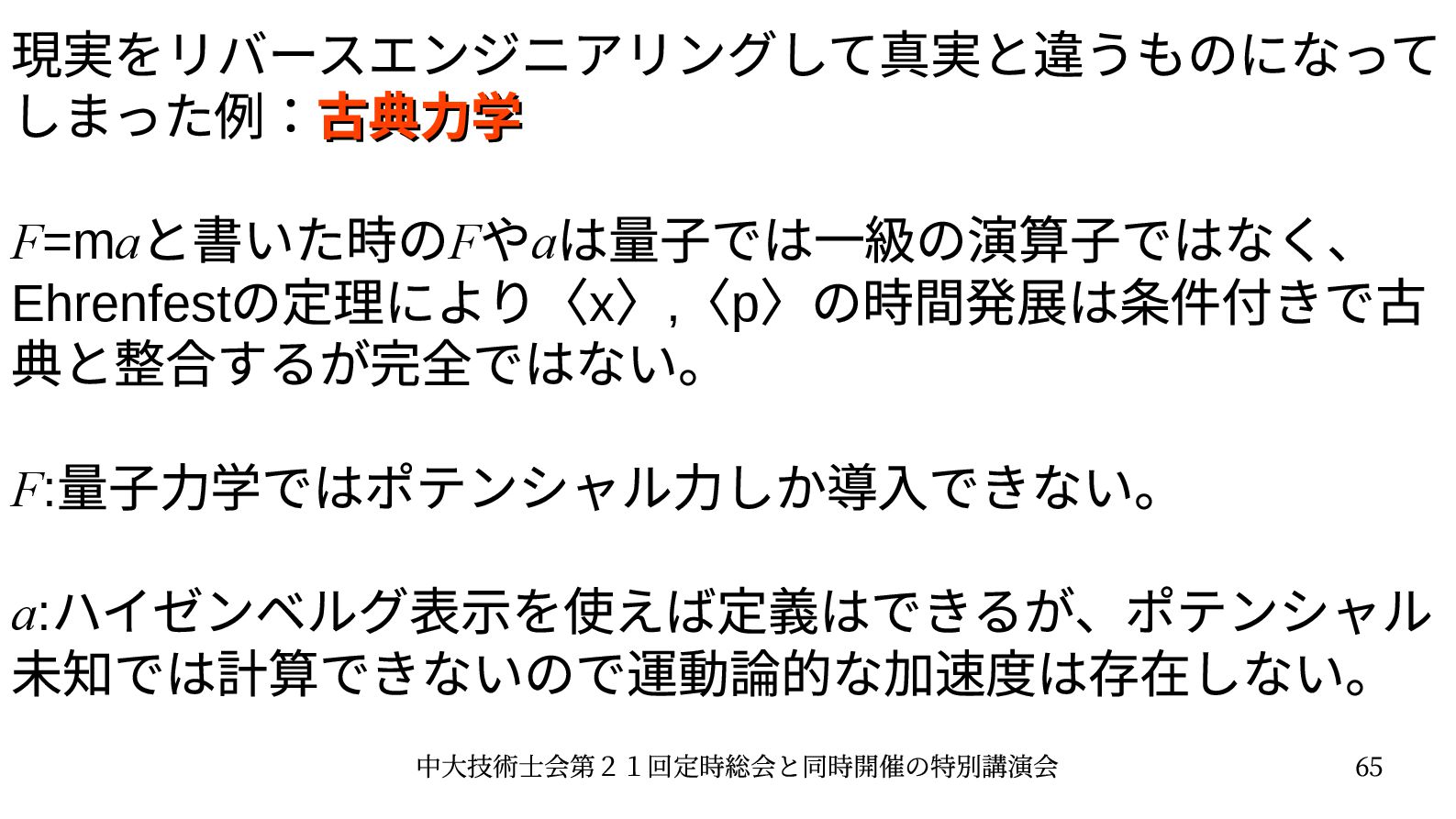 中大技術士会第21回定時総会と同時開催の特別講演会 65 現実をリバースエンジニアリングして真実と違うものになって しまった例:古典力学 古典力学 F=ma と書いた時のF やa は量子では一級の演算子ではなく、 Ehrenfest