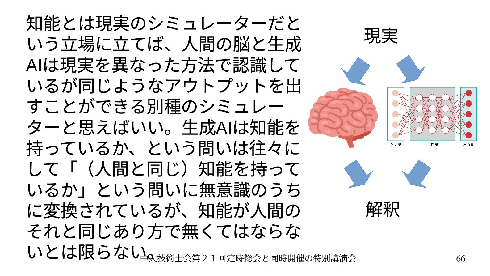 中大技術士会第21回定時総会と同時開催の特別講演会 66 知能とは現実のシミュレーターだと いう立場に立てば、人間の脳と生成 AI は現実を異なった方法で認識して いるが同じようなアウトプットを出 すことができる別種のシミュレー ターと思えばいい。生成AI は知能を