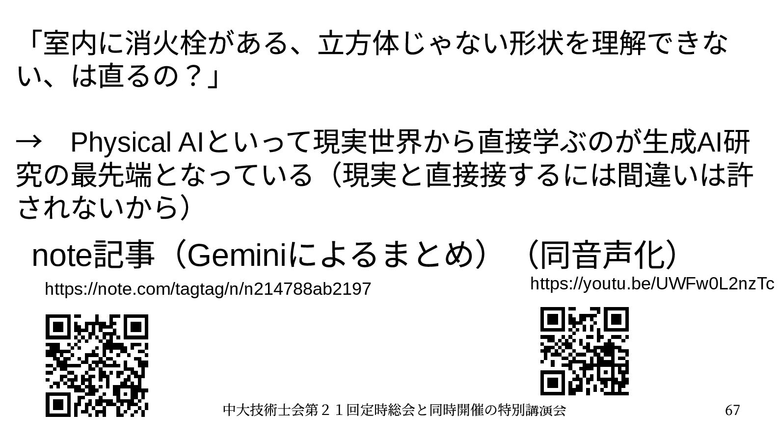 中大技術士会第21回定時総会と同時開催の特別講演会 67 「室内に消火栓がある、立方体じゃない形状を理解できな い、は直るの?」 → Physical AI といって現実世界から直接学ぶのが生成AI 研 究の最先端となっている(現実と直接接するには間違いは許 されないから)