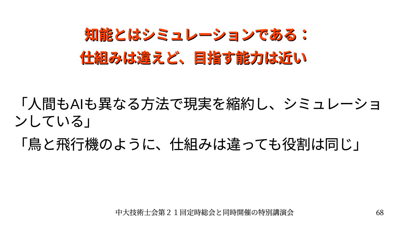 中大技術士会第21回定時総会と同時開催の特別講演会 68 知能とはシミュレーションである: 知能とはシミュレーションである: 仕組みは違えど、目指す能力は近い 仕組みは違えど、目指す能力は近い 「人間もAI も異なる方法で現実を縮約し、シミュレーショ ンしている」 「鳥と飛行機のように、仕組みは違っても役割は同じ」