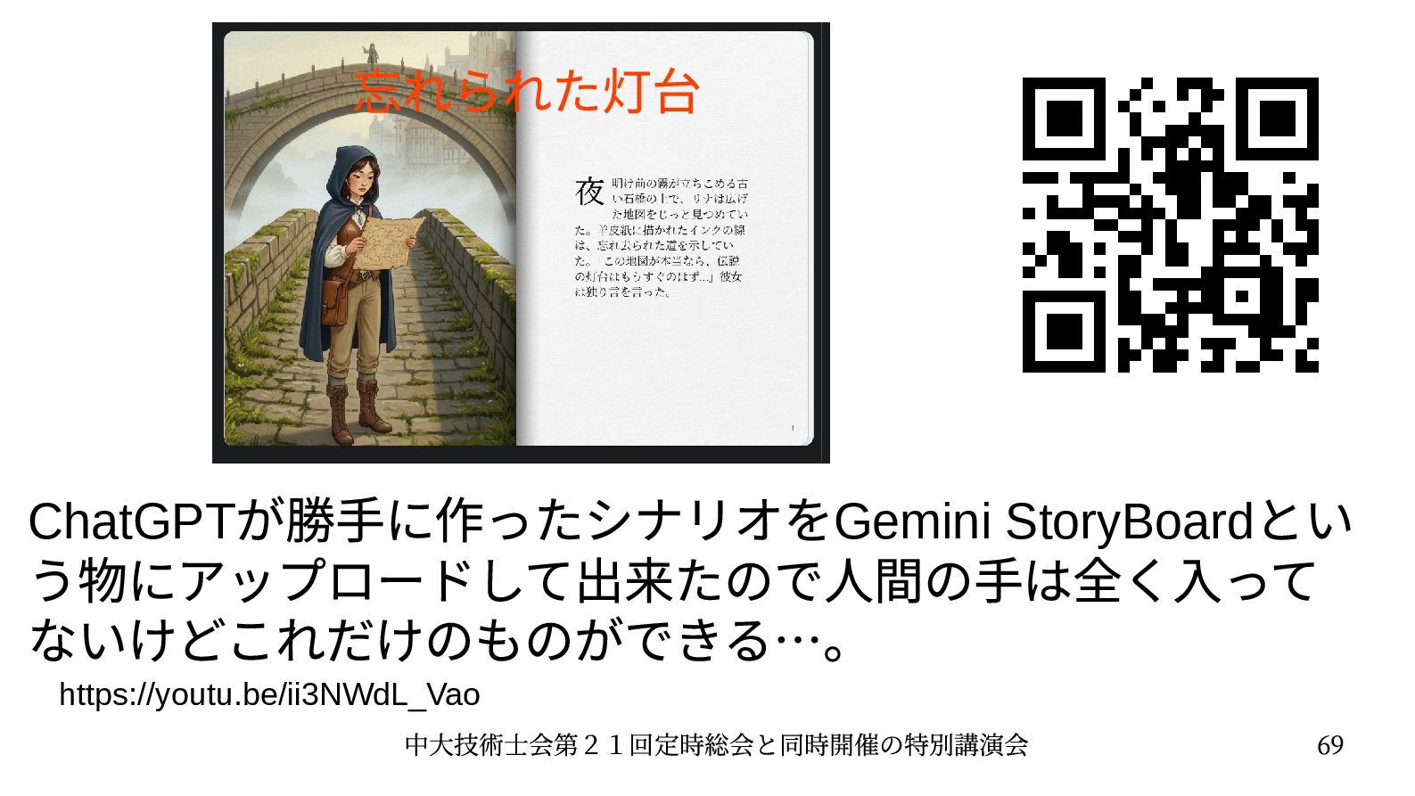 中大技術士会第21回定時総会と同時開催の特別講演会 69 https://youtu.be/ii3NWdL_Vao ChatGPT が勝手に作ったシナリオをGemini StoryBoard とい う物にアップロードして出来たので人間の手は全く入って ないけどこれだけのものができる…。 忘れられた灯台